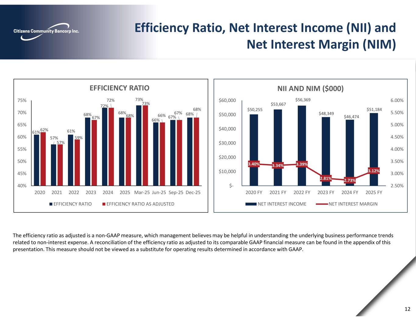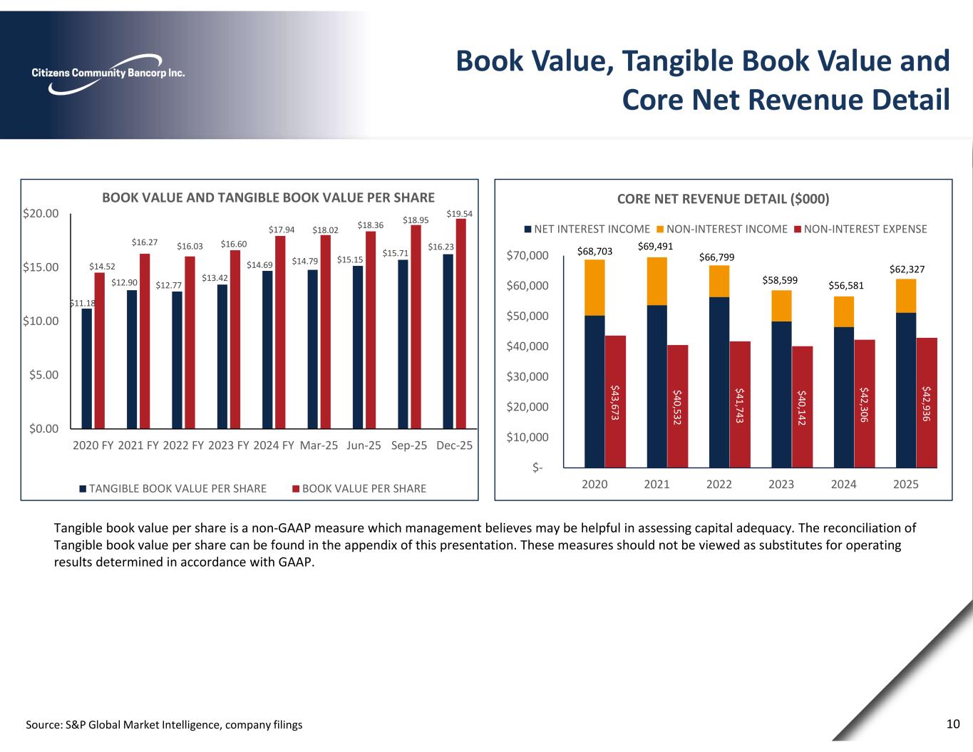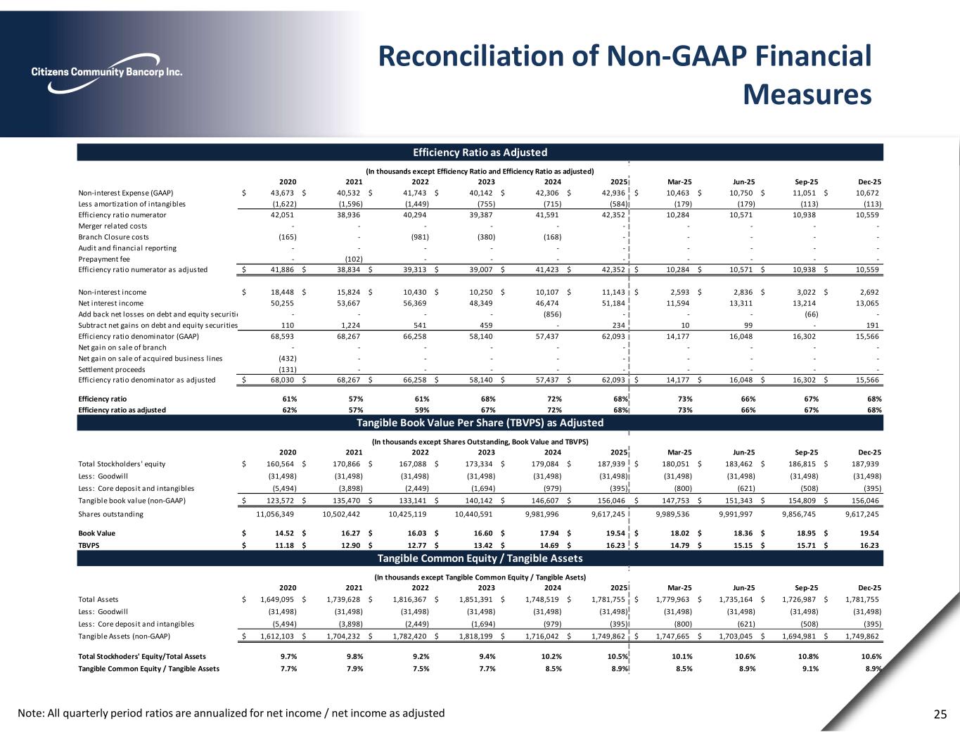 Reconciliation of Non-GAAP Financial Measures Note: All quarterly period ratios are annualized for net income / net income as adjusted 25 2020 2021 2022 2023 2024 2025 Mar-25 Jun-25 Sep-25 Dec-25 Non-interest Expense (GAAP) 43,673$ 40,532$ 41,743$ 40,142$ 42,306$ 42,936$ 10,463$ 10,750$ 11,051$ 10,672$ Less amortization of intangibles (1,622) (1,596) (1,449) (755) (715) (584) (179) (179) (113) (113) Efficiency ratio numerator 42,051 38,936 40,294 39,387 41,591 42,352 10,284 10,571 10,938 10,559 Merger related costs - - - - - - - - - - Branch Closure costs (165) - (981) (380) (168) - - - - - Audit and financial reporting - - - - - - - - - - Prepayment fee - (102) - - - - - - - - Efficiency ratio numerator as adjusted 41,886$ 38,834$ 39,313$ 39,007$ 41,423$ 42,352$ 10,284$ 10,571$ 10,938$ 10,559$ Non-interest income 18,448$ 15,824$ 10,430$ 10,250$ 10,107$ 11,143$ 2,593$ 2,836$ 3,022$ 2,692$ Net interest income 50,255 53,667 56,369 48,349 46,474 51,184 11,594 13,311 13,214 13,065 Add back net losses on debt and equity securities - - - - (856) - - - (66) - Subtract net gains on debt and equity securities 110 1,224 541 459 - 234 10 99 - 191 Efficiency ratio denominator (GAAP) 68,593 68,267 66,258 58,140 57,437 62,093 14,177 16,048 16,302 15,566 Net gain on sale of branch - - - - - - - - - - Net gain on sale of acquired business l ines (432) - - - - - - - - - Settlement proceeds (131) - - - - - - - - - Efficiency ratio denominator as adjusted 68,030$ 68,267$ 66,258$ 58,140$ 57,437$ 62,093$ 14,177$ 16,048$ 16,302$ 15,566$ Efficiency ratio 61% 57% 61% 68% 72% 68% 73% 66% 67% 68% Efficiency ratio as adjusted 62% 57% 59% 67% 72% 68% 73% 66% 67% 68% 2020 2021 2022 2023 2024 2025 Mar-25 Jun-25 Sep-25 Dec-25 Total Stockholders' equity 160,564$ 170,866$ 167,088$ 173,334$ 179,084$ 187,939$ 180,051$ 183,462$ 186,815$ 187,939$ Less: Goodwill (31,498) (31,498) (31,498) (31,498) (31,498) (31,498) (31,498) (31,498) (31,498) (31,498) Less: Core deposit and intangibles (5,494) (3,898) (2,449) (1,694) (979) (395) (800) (621) (508) (395) Tangible book value (non-GAAP) 123,572$ 135,470$ 133,141$ 140,142$ 146,607$ 156,046$ 147,753$ 151,343$ 154,809$ 156,046$ Shares outstanding 11,056,349 10,502,442 10,425,119 10,440,591 9,981,996 9,617,245 9,989,536 9,991,997 9,856,745 9,617,245 Book Value 14.52$ 16.27$ 16.03$ 16.60$ 17.94$ 19.54$ 18.02$ 18.36$ 18.95$ 19.54$ TBVPS 11.18$ 12.90$ 12.77$ 13.42$ 14.69$ 16.23$ 14.79$ 15.15$ 15.71$ 16.23$ 2020 2021 2022 2023 2024 2025 Mar-25 Jun-25 Sep-25 Dec-25 Total Assets 1,649,095$ 1,739,628$ 1,816,367$ 1,851,391$ 1,748,519$ 1,781,755$ 1,779,963$ 1,735,164$ 1,726,987$ 1,781,755$ Less: Goodwill (31,498) (31,498) (31,498) (31,498) (31,498) (31,498) (31,498) (31,498) (31,498) (31,498) Less: Core deposit and intangibles (5,494) (3,898) (2,449) (1,694) (979) (395) (800) (621) (508) (395) Tangible Assets (non-GAAP) 1,612,103$ 1,704,232$ 1,782,420$ 1,818,199$ 1,716,042$ 1,749,862$ 1,747,665$ 1,703,045$ 1,694,981$ 1,749,862$ Total Stockhoders' Equity/Total Assets 9.7% 9.8% 9.2% 9.4% 10.2% 10.5% 10.1% 10.6% 10.8% 10.6% Tangible Common Equity / Tangible Assets 7.7% 7.9% 7.5% 7.7% 8.5% 8.9% 8.5% 8.9% 9.1% 8.9% (In thousands except Tangible Common Equity / Tangible Asets) Efficiency Ratio as Adjusted Tangible Book Value Per Share (TBVPS) as Adjusted Tangible Common Equity / Tangible Assets (In thousands except Efficiency Ratio and Efficiency Ratio as adjusted) (In thousands except Shares Outstanding, Book Value and TBVPS)