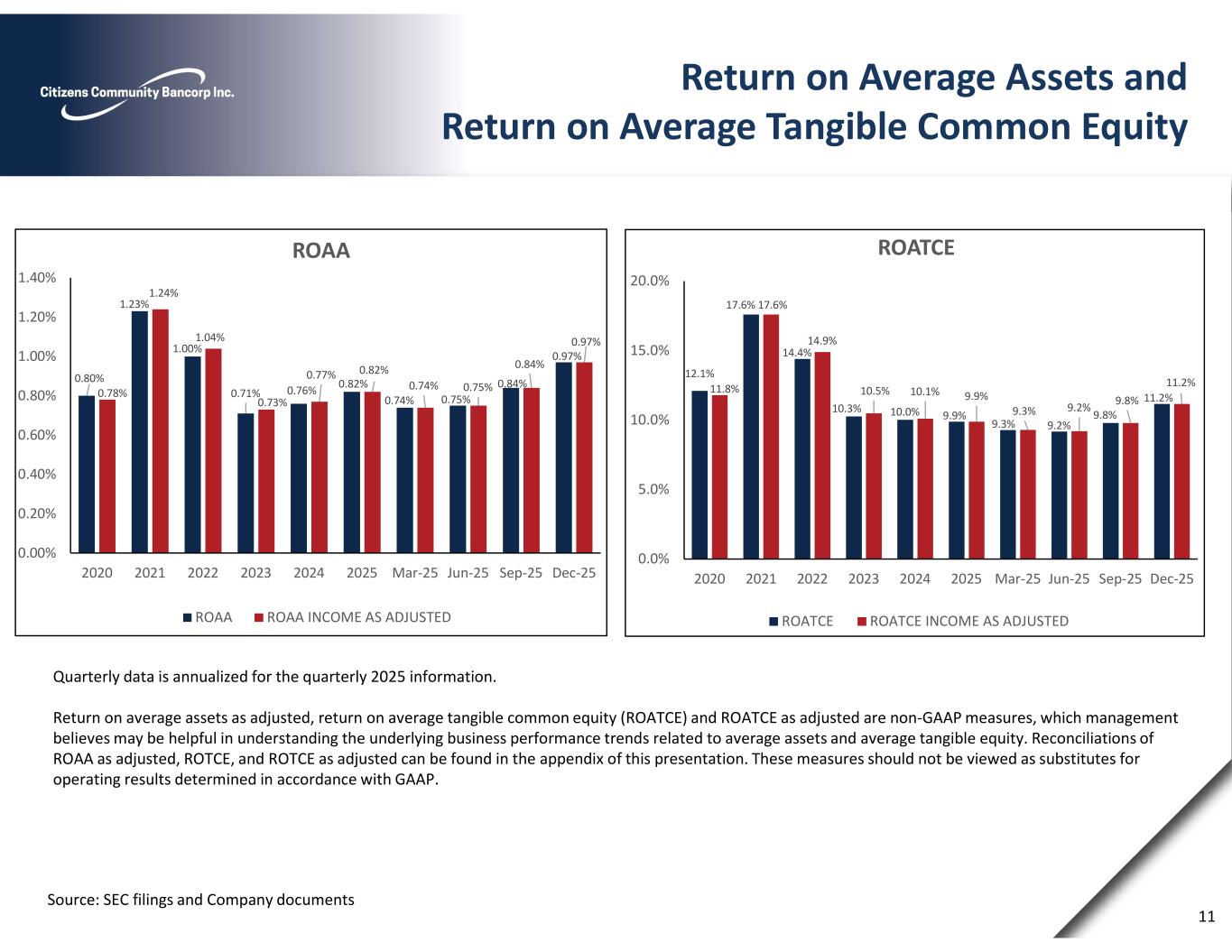 Book Value, Tangible Book Value and Core Net Revenue Detail Source: S&P Global Market Intelligence, company filings Tangible book value per share is a non-GAAP measure which management believes may be helpful in assessing capital adequacy. The reconciliation of Tangible book value per share can be found in the appendix of this presentation. These measures should not be viewed as substitutes for operating results determined in accordance with GAAP. 10 $11.18 $12.90 $12.77 $13.42 $14.69 $14.79 $15.15 $15.71 $16.23 $14.52 $16.27 $16.03 $16.60 $17.94 $18.02 $18.36 $18.95 $19.54 $0.00 $5.00 $10.00 $15.00 $20.00 2020 FY 2021 FY 2022 FY 2023 FY 2024 FY Mar-25 Jun-25 Sep-25 Dec-25 BOOK VALUE AND TANGIBLE BOOK VALUE PER SHARE TANGIBLE BOOK VALUE PER SHARE BOOK VALUE PER SHARE $43,673 $40,532 $41,743 $40,142 $42,306 $42,936 $- $10,000 $20,000 $30,000 $40,000 $50,000 $60,000 $70,000 2020 2021 2022 2023 2024 2025 CORE NET REVENUE DETAIL ($000) NET INTEREST INCOME NON-INTEREST INCOME NON-INTEREST EXPENSE $68,703 $69,491 $56,581$58,599 $62,327 $66,799