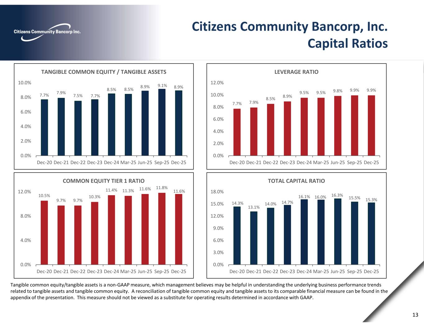 Efficiency Ratio, Net Interest Income (NII) and Net Interest Margin (NIM) The efficiency ratio as adjusted is a non-GAAP measure, which management believes may be helpful in understanding the underlying business performance trends related to non-interest expense. A reconciliation of the efficiency ratio as adjusted to its comparable GAAP financial measure can be found in the appendix of this presentation. This measure should not be viewed as a substitute for operating results determined in accordance with GAAP. 12 61% 57% 61% 68% 72% 68% 73% 66% 67% 68% 62% 57% 59% 67% 72% 68% 73% 66% 67% 68% 40% 45% 50% 55% 60% 65% 70% 75% 2020 2021 2022 2023 2024 2025 Mar-25 Jun-25 Sep-25 Dec-25 EFFICIENCY RATIO EFFICIENCY RATIO EFFICIENCY RATIO AS ADJUSTED $50,255 $53,667 $56,369 $48,349 $46,474 $51,184 3.40% 3.34% 3.39% 2.81% 2.73% 3.12% 2.50% 3.00% 3.50% 4.00% 4.50% 5.00% 5.50% 6.00% $- $10,000 $20,000 $30,000 $40,000 $50,000 $60,000 2020 FY 2021 FY 2022 FY 2023 FY 2024 FY 2025 FY NII AND NIM ($000) NET INTEREST INCOME NET INTEREST MARGIN