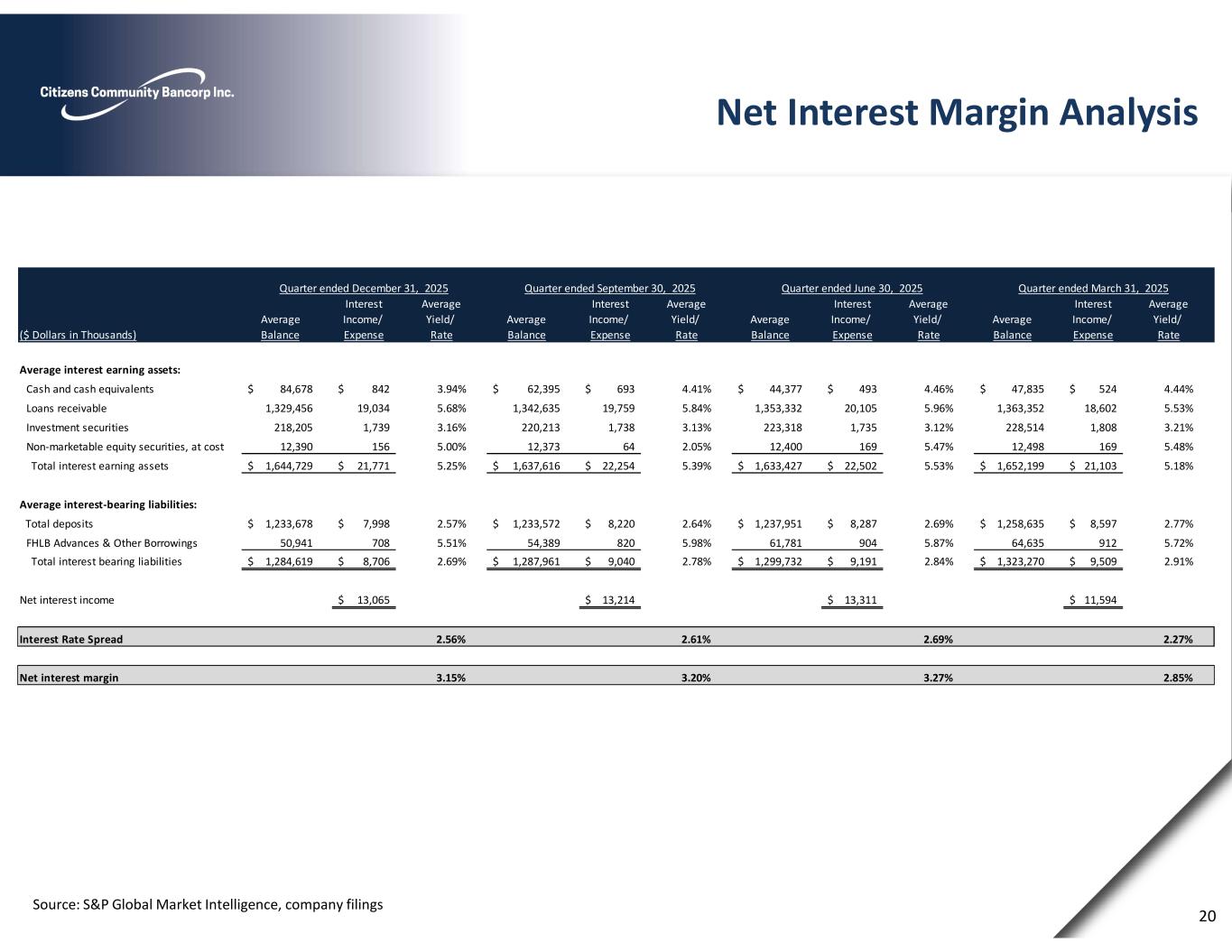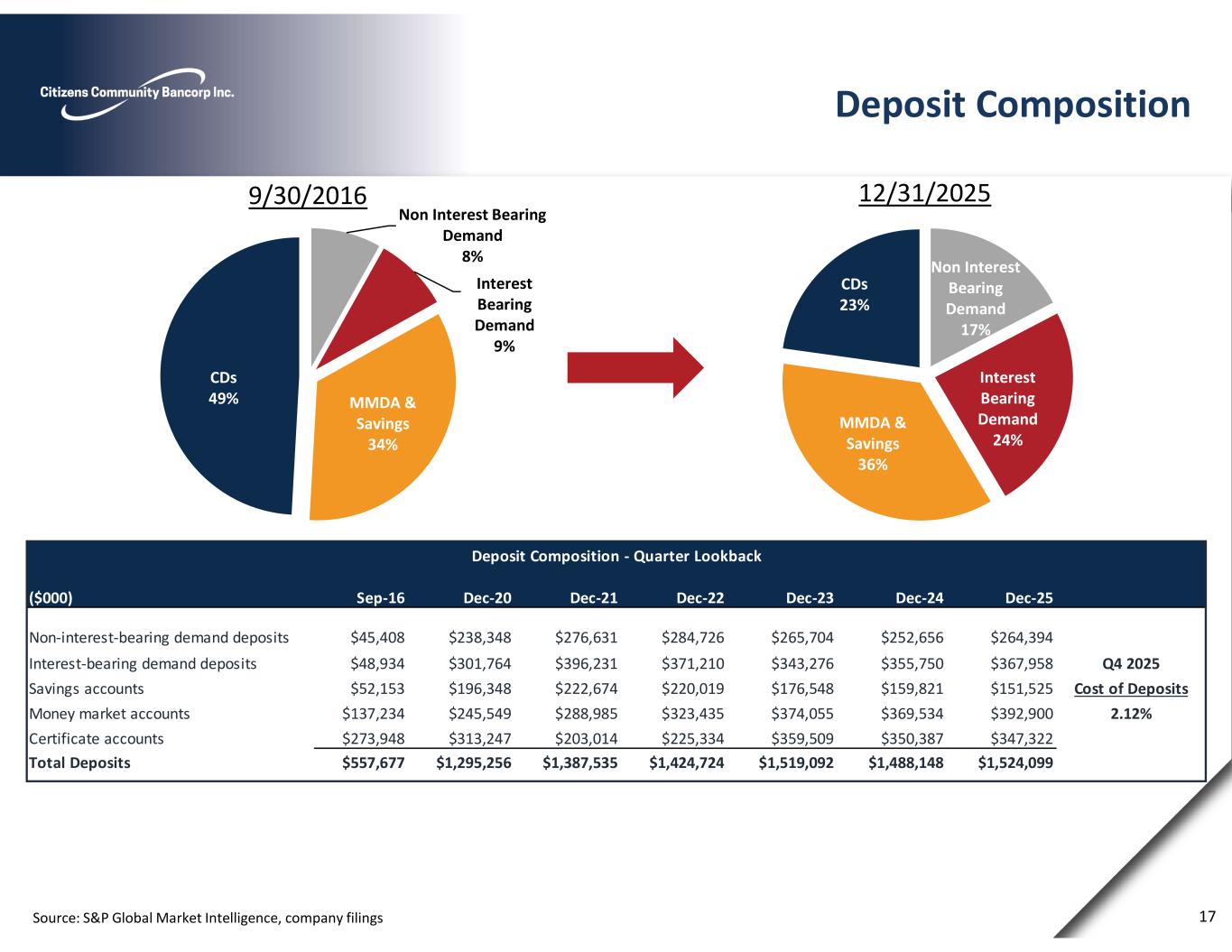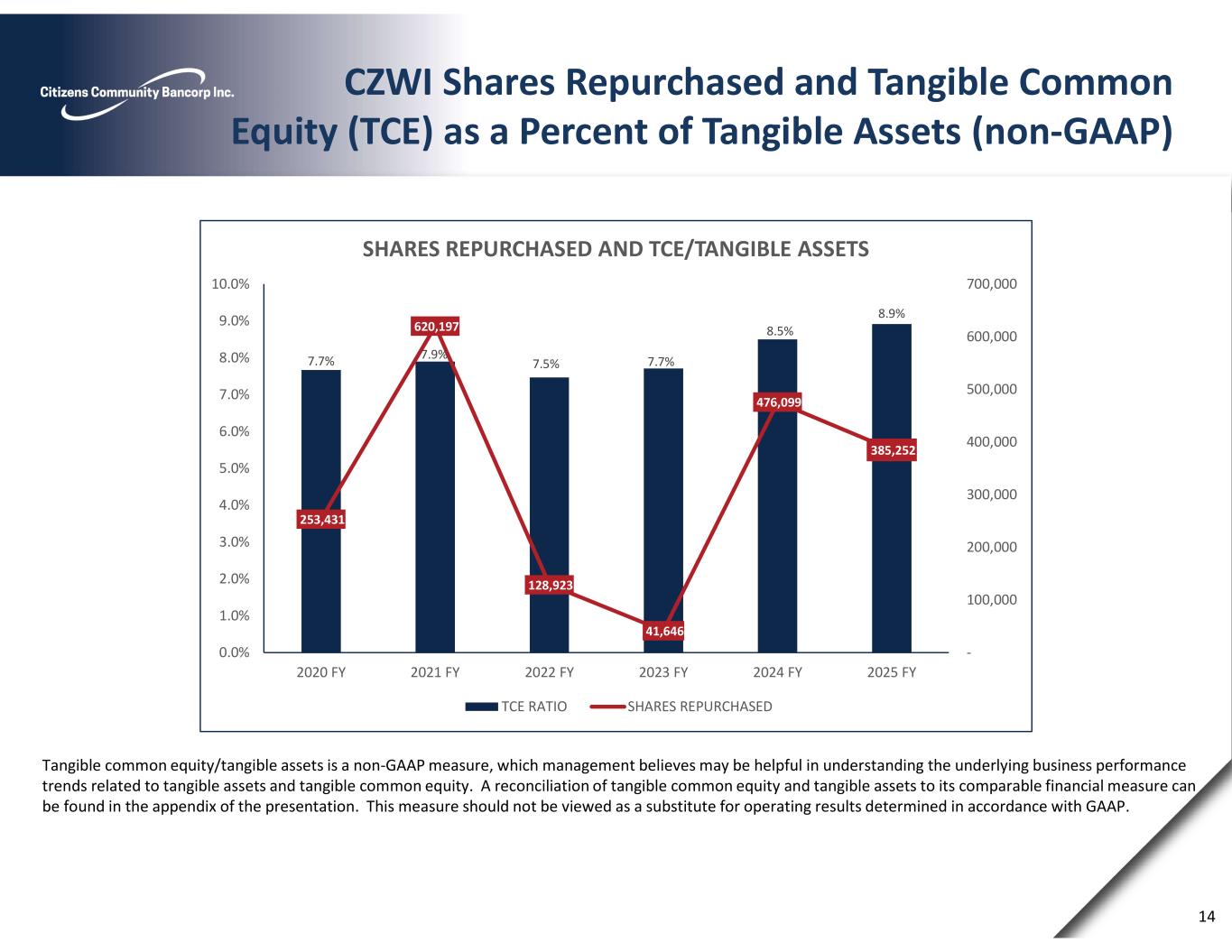 Citizens Community Bancorp, Inc. Capital Ratios 13 7.7% 7.9% 8.5% 8.9% 9.5% 9.5% 9.8% 9.9% 9.9% 0.0% 2.0% 4.0% 6.0% 8.0% 10.0% 12.0% Dec-20 Dec-21 Dec-22 Dec-23 Dec-24 Mar-25 Jun-25 Sep-25 Dec-25 LEVERAGE RATIO 10.5% 9.7% 9.7% 10.3% 11.4% 11.3% 11.6% 11.8% 11.6% 0.0% 4.0% 8.0% 12.0% Dec-20 Dec-21 Dec-22 Dec-23 Dec-24 Mar-25 Jun-25 Sep-25 Dec-25 COMMON EQUITY TIER 1 RATIO 14.3% 13.1% 14.0% 14.7% 16.1% 16.0% 16.3% 15.5% 15.3% 0.0% 3.0% 6.0% 9.0% 12.0% 15.0% 18.0% Dec-20 Dec-21 Dec-22 Dec-23 Dec-24 Mar-25 Jun-25 Sep-25 Dec-25 TOTAL CAPITAL RATIO Tangible common equity/tangible assets is a non-GAAP measure, which management believes may be helpful in understanding the underlying business performance trends related to tangible assets and tangible common equity. A reconciliation of tangible common equity and tangible assets to its comparable financial measure can be found in the appendix of the presentation. This measure should not be viewed as a substitute for operating results determined in accordance with GAAP. 7.7% 7.9% 7.5% 7.7% 8.5% 8.5% 8.9% 9.1% 8.9% 0.0% 2.0% 4.0% 6.0% 8.0% 10.0% Dec-20 Dec-21 Dec-22 Dec-23 Dec-24 Mar-25 Jun-25 Sep-25 Dec-25 TANGIBLE COMMON EQUITY / TANGIBLE ASSETS