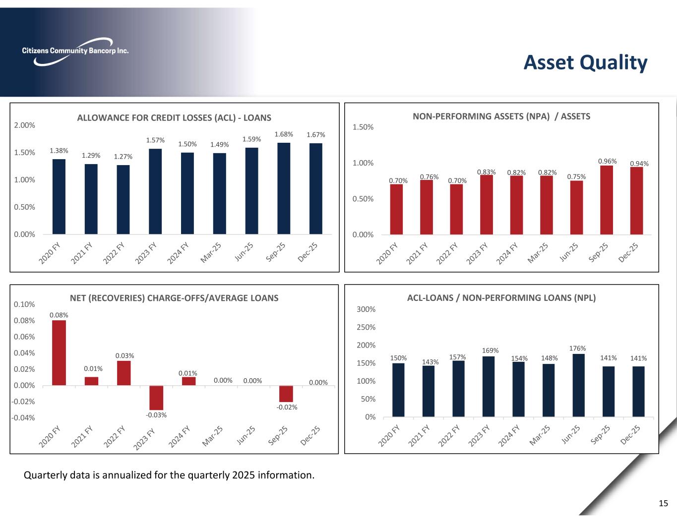 CZWI Shares Repurchased and Tangible Common Equity (TCE) as a Percent of Tangible Assets (non-GAAP) Tangible common equity/tangible assets is a non-GAAP measure, which management believes may be helpful in understanding the underlying business performance trends related to tangible assets and tangible common equity. A reconciliation of tangible common equity and tangible assets to its comparable financial measure can be found in the appendix of the presentation. This measure should not be viewed as a substitute for operating results determined in accordance with GAAP. 14 7.7% 7.9% 7.5% 7.7% 8.5% 8.9% 253,431 620,197 128,923 41,646 476,099 385,252 - 100,000 200,000 300,000 400,000 500,000 600,000 700,000 0.0% 1.0% 2.0% 3.0% 4.0% 5.0% 6.0% 7.0% 8.0% 9.0% 10.0% 2020 FY 2021 FY 2022 FY 2023 FY 2024 FY 2025 FY SHARES REPURCHASED AND TCE/TANGIBLE ASSETS TCE RATIO SHARES REPURCHASED