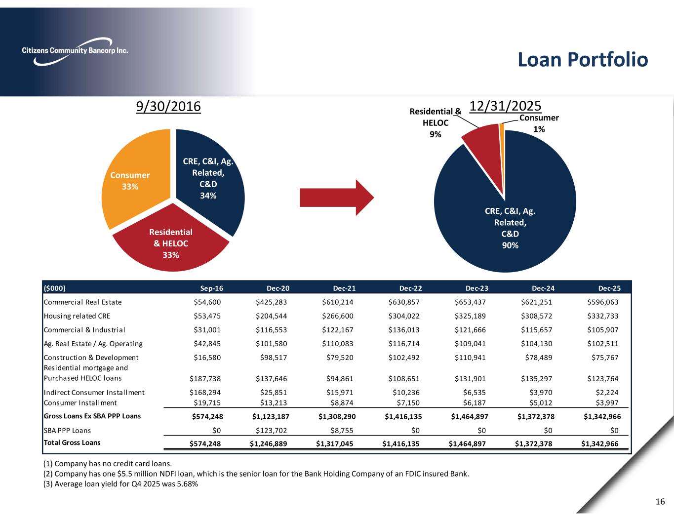 CRE, C&I, Ag. Related, C&D 90% Residential & HELOC 9% Consumer 1% Loan Portfolio 9/30/2016 12/31/2025 CRE, C&I, Ag. Related, C&D 34% Residential & HELOC 33% Consumer 33% 16 (1) Company has no credit card loans. (2) Company has one $5.5 million NDFI loan, which is the senior loan for the Bank Holding Company of an FDIC insured Bank. (3) Average loan yield for Q4 2025 was 5.68% ($000) Sep-16 Dec-20 Dec-21 Dec-22 Dec-23 Dec-24 Dec-25 Commercial Real Estate $54,600 $425,283 $610,214 $630,857 $653,437 $621,251 $596,063 Housing related CRE $53,475 $204,544 $266,600 $304,022 $325,189 $308,572 $332,733 Commercial & Industrial $31,001 $116,553 $122,167 $136,013 $121,666 $115,657 $105,907 Ag. Real Estate / Ag. Operating $42,845 $101,580 $110,083 $116,714 $109,041 $104,130 $102,511 Construction & Development $16,580 $98,517 $79,520 $102,492 $110,941 $78,489 $75,767 Residential mortgage and Purchased HELOC loans $187,738 $137,646 $94,861 $108,651 $131,901 $135,297 $123,764 Indirect Consumer Installment $168,294 $25,851 $15,971 $10,236 $6,535 $3,970 $2,224 Consumer Installment $19,715 $13,213 $8,874 $7,150 $6,187 $5,012 $3,997 Gross Loans Ex SBA PPP Loans $574,248 $1,123,187 $1,308,290 $1,416,135 $1,464,897 $1,372,378 $1,342,966 SBA PPP Loans $0 $123,702 $8,755 $0 $0 $0 $0 Total Gross Loans $574,248 $1,246,889 $1,317,045 $1,416,135 $1,464,897 $1,372,378 $1,342,966
