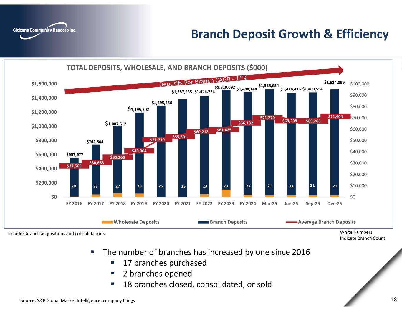$27,565 $30,653 $35,266 $40,904 $51,710 $55,501 $60,212 $61,425 $66,132 $71,270 $69,238 $69,266 $71,404 $0 $10,000 $20,000 $30,000 $40,000 $50,000 $60,000 $70,000 $80,000 $90,000 $100,000 $0 $200,000 $400,000 $600,000 $800,000 $1,000,000 $1,200,000 $1,400,000 $1,600,000 FY 2016 FY 2017 FY 2018 FY 2019 FY 2020 FY 2021 FY 2022 FY 2023 FY 2024 Mar-25 Jun-25 Sep-25 Dec-25 TOTAL DEPOSITS, WHOLESALE, AND BRANCH DEPOSITS ($000) Wholesale Deposits Branch Deposits Average Branch Deposits 23 27 28 25 2323 22 $557,677 $742,504 $1,007,512 $1,195,702 $1,295,256 $1,519,092 21 $1,523,654 21 $1,478,416$1,488,148 $1,480,554 21 $1,524,099 212520 Branch Deposit Growth & Efficiency Includes branch acquisitions and consolidations 18 20 White Numbers Indicate Branch Count $1,387,535 $1,424,724 Source: S&P Global Market Intelligence, company filings The number of branches has increased by one since 2016 17 branches purchased 2 branches opened 18 branches closed, consolidated, or sold