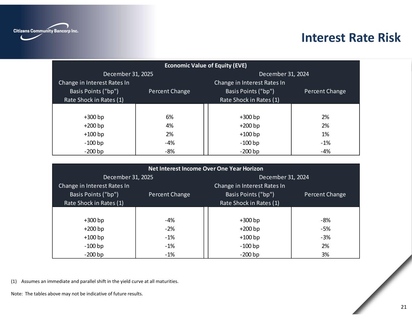 Net Interest Margin Analysis Source: S&P Global Market Intelligence, company filings 20 Quarter ended December 31, 2025 Quarter ended September 30, 2025 Quarter ended June 30, 2025 Quarter ended March 31, 2025 Interest Average Interest Average Interest Average Interest Average Average Income/ Yield/ Average Income/ Yield/ Average Income/ Yield/ Average Income/ Yield/ ($ Dollars in Thousands) Balance Expense Rate Balance Expense Rate Balance Expense Rate Balance Expense Rate Average interest earning assets: Cash and cash equivalents 84,678$ 842$ 3.94% 62,395$ 693$ 4.41% 44,377$ 493$ 4.46% 47,835$ 524$ 4.44% Loans receivable 1,329,456 19,034 5.68% 1,342,635 19,759 5.84% 1,353,332 20,105 5.96% 1,363,352 18,602 5.53% Investment securities 218,205 1,739 3.16% 220,213 1,738 3.13% 223,318 1,735 3.12% 228,514 1,808 3.21% Non-marketable equity securities, at cost 12,390 156 5.00% 12,373 64 2.05% 12,400 169 5.47% 12,498 169 5.48% Total interest earning assets 1,644,729$ 21,771$ 5.25% 1,637,616$ 22,254$ 5.39% 1,633,427$ 22,502$ 5.53% 1,652,199$ 21,103$ 5.18% Average interest-bearing liabilities: Total deposits 1,233,678$ 7,998$ 2.57% 1,233,572$ 8,220$ 2.64% 1,237,951$ 8,287$ 2.69% 1,258,635$ 8,597$ 2.77% FHLB Advances & Other Borrowings 50,941 708 5.51% 54,389 820 5.98% 61,781 904 5.87% 64,635 912 5.72% Total interest bearing liabilities 1,284,619$ 8,706$ 2.69% 1,287,961$ 9,040$ 2.78% 1,299,732$ 9,191$ 2.84% 1,323,270$ 9,509$ 2.91% Net interest income 13,065$ 13,214$ 13,311$ 11,594$ Interest Rate Spread 2.56% 2.61% 2.69% 2.27% Net interest margin 3.15% 3.20% 3.27% 2.85%