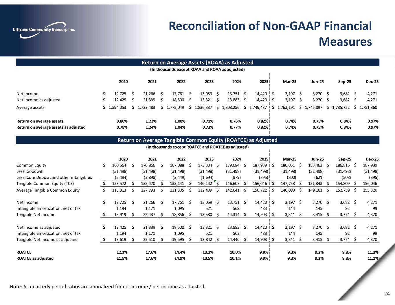 Note: All quarterly period ratios are annualized for net income / net income as adjusted. 24 Reconciliation of Non-GAAP Financial Measures 2020 2021 2022 2023 2024 2025 Mar-25 Jun-25 Sep-25 Dec-25 Net Income 12,725$ 21,266$ 17,761$ 13,059$ 13,751$ 14,420$ 3,197$ 3,270$ 3,682$ 4,271$ Net Income as adjusted 12,425$ 21,339$ 18,500$ 13,321$ 13,883$ 14,420$ 3,197$ 3,270$ 3,682$ 4,271$ Average assets 1,594,053$ 1,722,483$ 1,775,049$ 1,836,337$ 1,808,256$ 1,749,437$ 1,763,191$ 1,745,897$ 1,735,752$ 1,751,360$ Return on average assets 0.80% 1.23% 1.00% 0.71% 0.76% 0.82% 0.74% 0.75% 0.84% 0.97% Return on average assets as adjusted 0.78% 1.24% 1.04% 0.73% 0.77% 0.82% 0.74% 0.75% 0.84% 0.97% 2020 2021 2022 2023 2024 2025 Mar-25 Jun-25 Sep-25 Dec-25 Common Equity 160,564$ 170,866$ 167,088$ 173,334$ 179,084$ 187,939$ 180,051$ 183,462$ 186,815$ 187,939$ Less: Goodwill (31,498) (31,498) (31,498) (31,498) (31,498) (31,498) (31,498) (31,498) (31,498) (31,498) Less: Core Deposit and other intangibles (5,494) (3,898) (2,449) (1,694) (979) (395) (800) (621) (508) (395) Tangible Common Equity (TCE) 123,572$ 135,470$ 133,141$ 140,142$ 146,607$ 156,046$ 147,753$ 151,343$ 154,809$ 156,046$ Average Tangible Common Equity 115,313$ 127,793$ 131,305$ 132,409$ 142,641$ 150,722$ 146,083$ 149,161$ 152,759$ 155,320$ Net Income 12,725$ 21,266$ 17,761$ 13,059$ 13,751$ 14,420$ 3,197$ 3,270$ 3,682$ 4,271$ Intangible amortization, net of tax 1,194 1,171 1,095 521 563 483 144 145 92 99 Tangible Net Income 13,919$ 22,437$ 18,856$ 13,580$ 14,314$ 14,903$ 3,341$ 3,415$ 3,774$ 4,370$ Net Income as adjusted 12,425$ 21,339$ 18,500$ 13,321$ 13,883$ 14,420$ 3,197$ 3,270$ 3,682$ 4,271$ Intangible amortization, net of tax 1,194 1,171 1,095 521 563 483 144 145 92 99 Tangible Net Income as adjusted 13,619$ 22,510$ 19,595$ 13,842$ 14,446$ 14,903$ 3,341$ 3,415$ 3,774$ 4,370$ ROATCE 12.1% 17.6% 14.4% 10.3% 10.0% 9.9% 9.3% 9.2% 9.8% 11.2% ROATCE as adjusted 11.8% 17.6% 14.9% 10.5% 10.1% 9.9% 9.3% 9.2% 9.8% 11.2% Return on Average Assets (ROAA) as Adjusted Return on Average Tangible Common Equity (ROATCE) as Adjusted (In thousands except ROAA and ROAA as adjusted) (In thousands except ROATCE and ROATCE as adjusted)