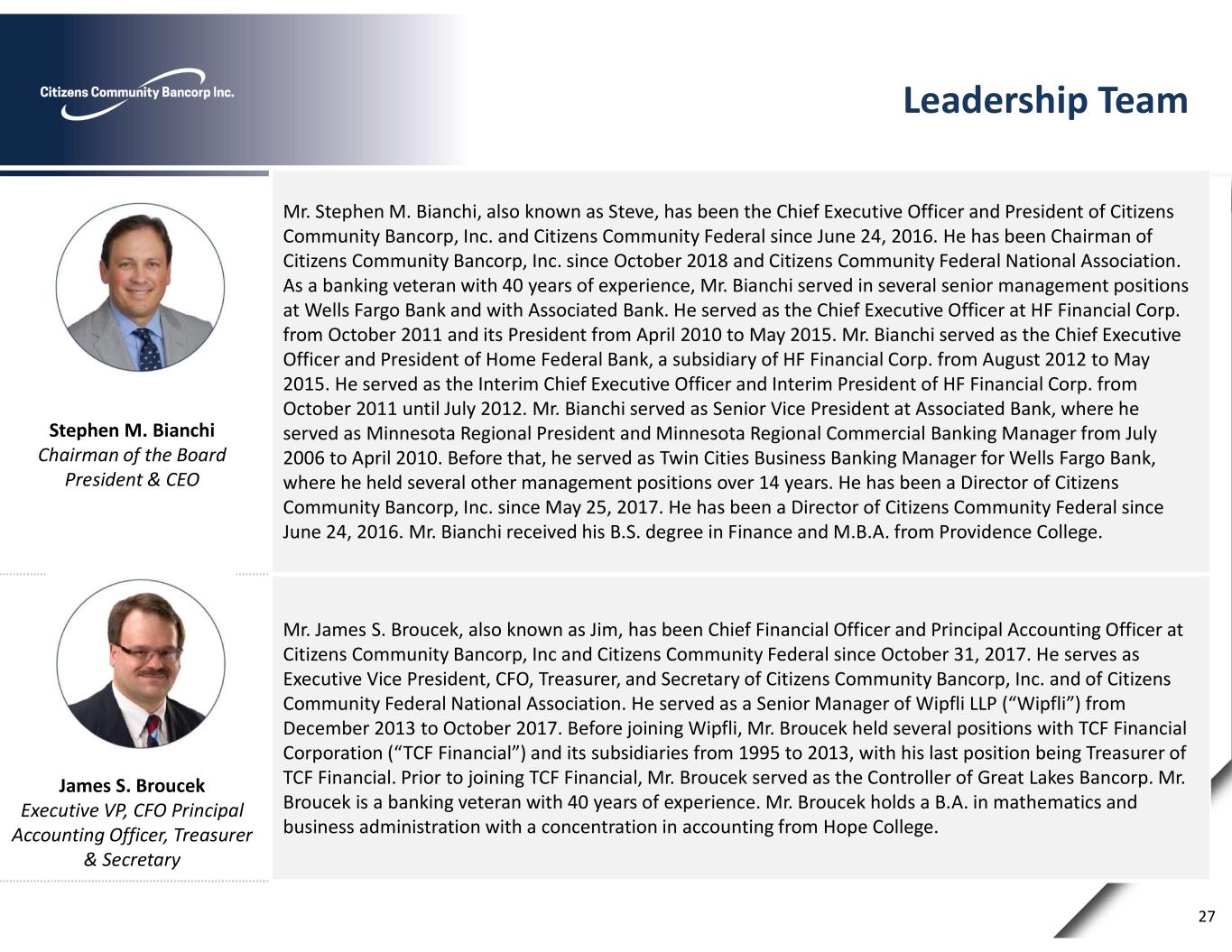 Leadership Team Mr. Stephen M. Bianchi, also known as Steve, has been the Chief Executive Officer and President of Citizens Community Bancorp, Inc. and Citizens Community Federal since June 24, 2016. He has been Chairman of Citizens Community Bancorp, Inc. since October 2018 and Citizens Community Federal National Association. As a banking veteran with 40 years of experience, Mr. Bianchi served in several senior management positions at Wells Fargo Bank and with Associated Bank. He served as the Chief Executive Officer at HF Financial Corp. from October 2011 and its President from April 2010 to May 2015. Mr. Bianchi served as the Chief Executive Officer and President of Home Federal Bank, a subsidiary of HF Financial Corp. from August 2012 to May 2015. He served as the Interim Chief Executive Officer and Interim President of HF Financial Corp. from October 2011 until July 2012. Mr. Bianchi served as Senior Vice President at Associated Bank, where he served as Minnesota Regional President and Minnesota Regional Commercial Banking Manager from July 2006 to April 2010. Before that, he served as Twin Cities Business Banking Manager for Wells Fargo Bank, where he held several other management positions over 14 years. He has been a Director of Citizens Community Bancorp, Inc. since May 25, 2017. He has been a Director of Citizens Community Federal since June 24, 2016. Mr. Bianchi received his B.S. degree in Finance and M.B.A. from Providence College. Stephen M. Bianchi Chairman of the Board President & CEO Mr. James S. Broucek, also known as Jim, has been Chief Financial Officer and Principal Accounting Officer at Citizens Community Bancorp, Inc and Citizens Community Federal since October 31, 2017. He serves as Executive Vice President, CFO, Treasurer, and Secretary of Citizens Community Bancorp, Inc. and of Citizens Community Federal National Association. He served as a Senior Manager of Wipfli LLP (“Wipfli”) from December 2013 to October 2017. Before joining Wipfli, Mr. Broucek held several positions with TCF Financial Corporation (“TCF Financial”) and its subsidiaries from 1995 to 2013, with his last position being Treasurer of TCF Financial. Prior to joining TCF Financial, Mr. Broucek served as the Controller of Great Lakes Bancorp. Mr. Broucek is a banking veteran with 40 years of experience. Mr. Broucek holds a B.A. in mathematics and business administration with a concentration in accounting from Hope College. James S. Broucek Executive VP, CFO Principal Accounting Officer, Treasurer & Secretary 27
