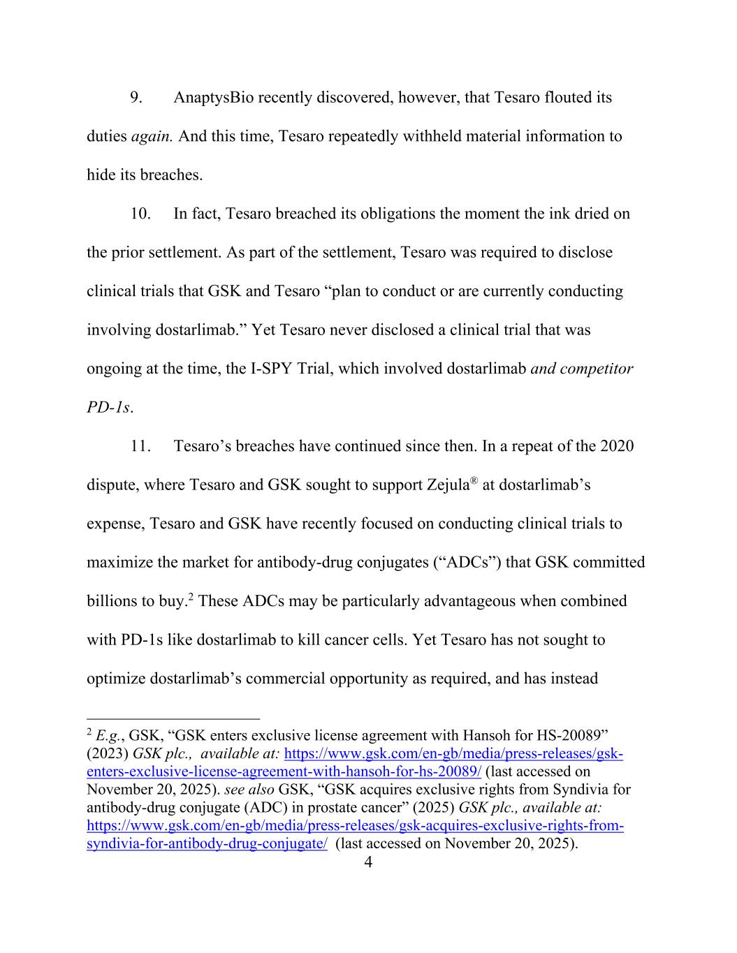 4 9. AnaptysBio recently discovered, however, that Tesaro flouted its duties again. And this time, Tesaro repeatedly withheld material information to hide its breaches. 10. In fact, Tesaro breached its obligations the moment the ink dried on the prior settlement. As part of the settlement, Tesaro was required to disclose clinical trials that GSK and Tesaro “plan to conduct or are currently conducting involving dostarlimab.” Yet Tesaro never disclosed a clinical trial that was ongoing at the time, the I-SPY Trial, which involved dostarlimab and competitor PD-1s. 11. Tesaro’s breaches have continued since then. In a repeat of the 2020 dispute, where Tesaro and GSK sought to support Zejula® at dostarlimab’s expense, Tesaro and GSK have recently focused on conducting clinical trials to maximize the market for antibody-drug conjugates (“ADCs”) that GSK committed billions to buy.2 These ADCs may be particularly advantageous when combined with PD-1s like dostarlimab to kill cancer cells. Yet Tesaro has not sought to optimize dostarlimab’s commercial opportunity as required, and has instead 2 E.g., GSK, “GSK enters exclusive license agreement with Hansoh for HS-20089” (2023) GSK plc., available at: https://www.gsk.com/en-gb/media/press-releases/gsk- enters-exclusive-license-agreement-with-hansoh-for-hs-20089/ (last accessed on November 20, 2025). see also GSK, “GSK acquires exclusive rights from Syndivia for antibody-drug conjugate (ADC) in prostate cancer” (2025) GSK plc., available at: https://www.gsk.com/en-gb/media/press-releases/gsk-acquires-exclusive-rights-from- syndivia-for-antibody-drug-conjugate/ (last accessed on November 20, 2025).