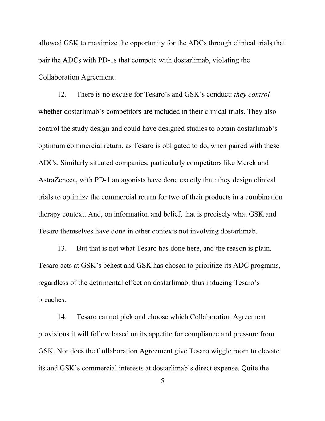5 allowed GSK to maximize the opportunity for the ADCs through clinical trials that pair the ADCs with PD-1s that compete with dostarlimab, violating the Collaboration Agreement. 12. There is no excuse for Tesaro’s and GSK’s conduct: they control whether dostarlimab’s competitors are included in their clinical trials. They also control the study design and could have designed studies to obtain dostarlimab’s optimum commercial return, as Tesaro is obligated to do, when paired with these ADCs. Similarly situated companies, particularly competitors like Merck and AstraZeneca, with PD-1 antagonists have done exactly that: they design clinical trials to optimize the commercial return for two of their products in a combination therapy context. And, on information and belief, that is precisely what GSK and Tesaro themselves have done in other contexts not involving dostarlimab. 13. But that is not what Tesaro has done here, and the reason is plain. Tesaro acts at GSK’s behest and GSK has chosen to prioritize its ADC programs, regardless of the detrimental effect on dostarlimab, thus inducing Tesaro’s breaches. 14. Tesaro cannot pick and choose which Collaboration Agreement provisions it will follow based on its appetite for compliance and pressure from GSK. Nor does the Collaboration Agreement give Tesaro wiggle room to elevate its and GSK’s commercial interests at dostarlimab’s direct expense. Quite the
