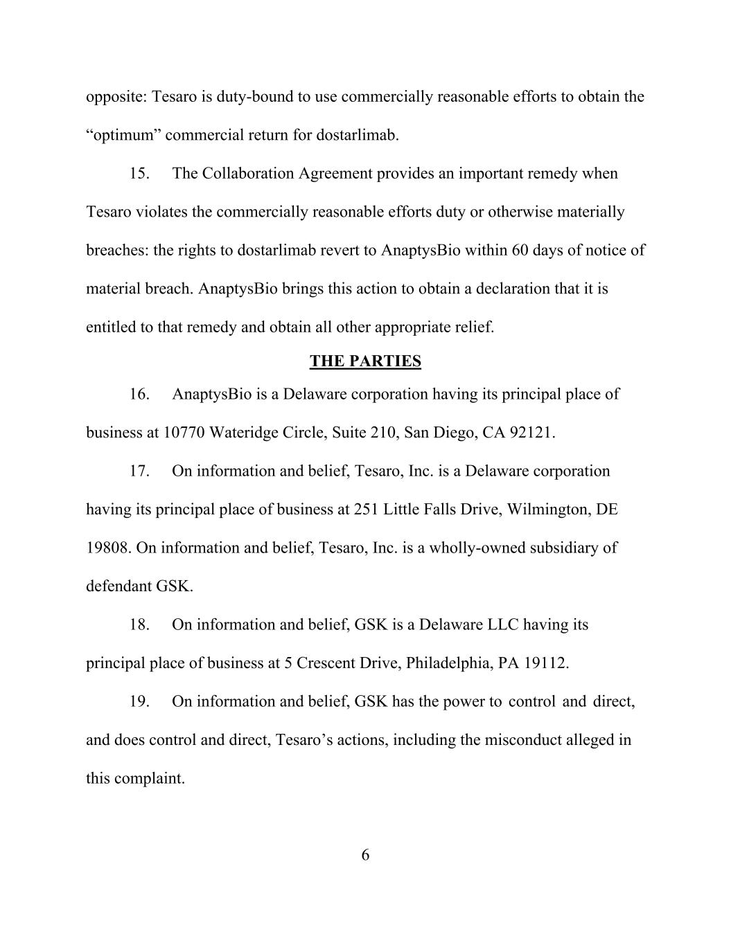 6 opposite: Tesaro is duty-bound to use commercially reasonable efforts to obtain the “optimum” commercial return for dostarlimab. 15. The Collaboration Agreement provides an important remedy when Tesaro violates the commercially reasonable efforts duty or otherwise materially breaches: the rights to dostarlimab revert to AnaptysBio within 60 days of notice of material breach. AnaptysBio brings this action to obtain a declaration that it is entitled to that remedy and obtain all other appropriate relief. THE PARTIES 16. AnaptysBio is a Delaware corporation having its principal place of business at 10770 Wateridge Circle, Suite 210, San Diego, CA 92121. 17. On information and belief, Tesaro, Inc. is a Delaware corporation having its principal place of business at 251 Little Falls Drive, Wilmington, DE 19808. On information and belief, Tesaro, Inc. is a wholly-owned subsidiary of defendant GSK. 18. On information and belief, GSK is a Delaware LLC having its principal place of business at 5 Crescent Drive, Philadelphia, PA 19112. 19. On information and belief, GSK has the power to control and direct, and does control and direct, Tesaro’s actions, including the misconduct alleged in this complaint.