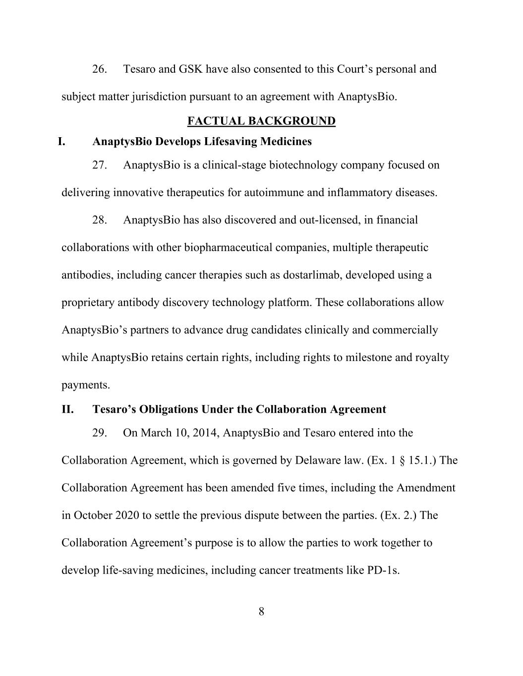 8 26. Tesaro and GSK have also consented to this Court’s personal and subject matter jurisdiction pursuant to an agreement with AnaptysBio. FACTUAL BACKGROUND I. AnaptysBio Develops Lifesaving Medicines 27. AnaptysBio is a clinical-stage biotechnology company focused on delivering innovative therapeutics for autoimmune and inflammatory diseases. 28. AnaptysBio has also discovered and out-licensed, in financial collaborations with other biopharmaceutical companies, multiple therapeutic antibodies, including cancer therapies such as dostarlimab, developed using a proprietary antibody discovery technology platform. These collaborations allow AnaptysBio’s partners to advance drug candidates clinically and commercially while AnaptysBio retains certain rights, including rights to milestone and royalty payments. II. Tesaro’s Obligations Under the Collaboration Agreement 29. On March 10, 2014, AnaptysBio and Tesaro entered into the Collaboration Agreement, which is governed by Delaware law. (Ex. 1 § 15.1.) The Collaboration Agreement has been amended five times, including the Amendment in October 2020 to settle the previous dispute between the parties. (Ex. 2.) The Collaboration Agreement’s purpose is to allow the parties to work together to develop life-saving medicines, including cancer treatments like PD-1s.