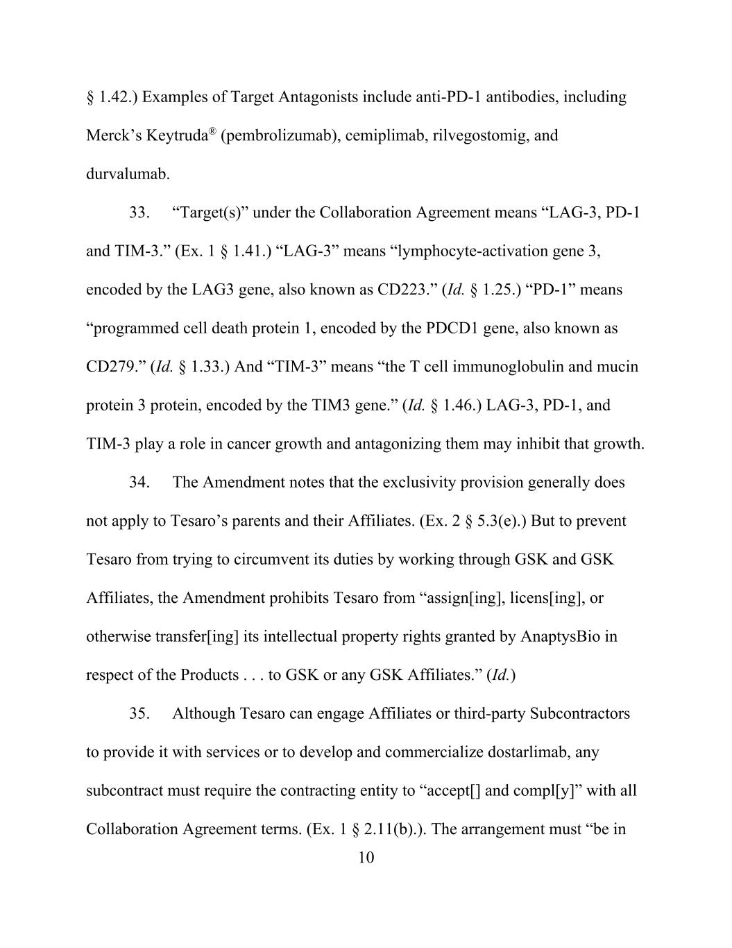 10 § 1.42.) Examples of Target Antagonists include anti-PD-1 antibodies, including Merck’s Keytruda® (pembrolizumab), cemiplimab, rilvegostomig, and durvalumab. 33. “Target(s)” under the Collaboration Agreement means “LAG-3, PD-1 and TIM-3.” (Ex. 1 § 1.41.) “LAG-3” means “lymphocyte-activation gene 3, encoded by the LAG3 gene, also known as CD223.” (Id. § 1.25.) “PD-1” means “programmed cell death protein 1, encoded by the PDCD1 gene, also known as CD279.” (Id. § 1.33.) And “TIM-3” means “the T cell immunoglobulin and mucin protein 3 protein, encoded by the TIM3 gene.” (Id. § 1.46.) LAG-3, PD-1, and TIM-3 play a role in cancer growth and antagonizing them may inhibit that growth. 34. The Amendment notes that the exclusivity provision generally does not apply to Tesaro’s parents and their Affiliates. (Ex. 2 § 5.3(e).) But to prevent Tesaro from trying to circumvent its duties by working through GSK and GSK Affiliates, the Amendment prohibits Tesaro from “assign[ing], licens[ing], or otherwise transfer[ing] its intellectual property rights granted by AnaptysBio in respect of the Products . . . to GSK or any GSK Affiliates.” (Id.) 35. Although Tesaro can engage Affiliates or third-party Subcontractors to provide it with services or to develop and commercialize dostarlimab, any subcontract must require the contracting entity to “accept[] and compl[y]” with all Collaboration Agreement terms. (Ex. 1 § 2.11(b).). The arrangement must “be in