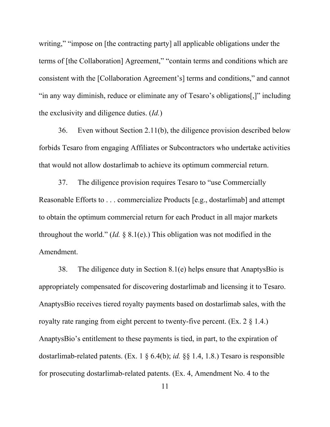 11 writing,” “impose on [the contracting party] all applicable obligations under the terms of [the Collaboration] Agreement,” “contain terms and conditions which are consistent with the [Collaboration Agreement’s] terms and conditions,” and cannot “in any way diminish, reduce or eliminate any of Tesaro’s obligations[,]” including the exclusivity and diligence duties. (Id.) 36. Even without Section 2.11(b), the diligence provision described below forbids Tesaro from engaging Affiliates or Subcontractors who undertake activities that would not allow dostarlimab to achieve its optimum commercial return. 37. The diligence provision requires Tesaro to “use Commercially Reasonable Efforts to . . . commercialize Products [e.g., dostarlimab] and attempt to obtain the optimum commercial return for each Product in all major markets throughout the world.” (Id. § 8.1(e).) This obligation was not modified in the Amendment. 38. The diligence duty in Section 8.1(e) helps ensure that AnaptysBio is appropriately compensated for discovering dostarlimab and licensing it to Tesaro. AnaptysBio receives tiered royalty payments based on dostarlimab sales, with the royalty rate ranging from eight percent to twenty-five percent. (Ex. 2 § 1.4.) AnaptysBio’s entitlement to these payments is tied, in part, to the expiration of dostarlimab-related patents. (Ex. 1 § 6.4(b); id. §§ 1.4, 1.8.) Tesaro is responsible for prosecuting dostarlimab-related patents. (Ex. 4, Amendment No. 4 to the