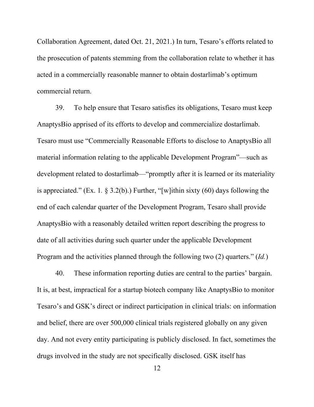 12 Collaboration Agreement, dated Oct. 21, 2021.) In turn, Tesaro’s efforts related to the prosecution of patents stemming from the collaboration relate to whether it has acted in a commercially reasonable manner to obtain dostarlimab’s optimum commercial return. 39. To help ensure that Tesaro satisfies its obligations, Tesaro must keep AnaptysBio apprised of its efforts to develop and commercialize dostarlimab. Tesaro must use “Commercially Reasonable Efforts to disclose to AnaptysBio all material information relating to the applicable Development Program”—such as development related to dostarlimab—“promptly after it is learned or its materiality is appreciated.” (Ex. 1. § 3.2(b).) Further, “[w]ithin sixty (60) days following the end of each calendar quarter of the Development Program, Tesaro shall provide AnaptysBio with a reasonably detailed written report describing the progress to date of all activities during such quarter under the applicable Development Program and the activities planned through the following two (2) quarters.” (Id.) 40. These information reporting duties are central to the parties’ bargain. It is, at best, impractical for a startup biotech company like AnaptysBio to monitor Tesaro’s and GSK’s direct or indirect participation in clinical trials: on information and belief, there are over 500,000 clinical trials registered globally on any given day. And not every entity participating is publicly disclosed. In fact, sometimes the drugs involved in the study are not specifically disclosed. GSK itself has
