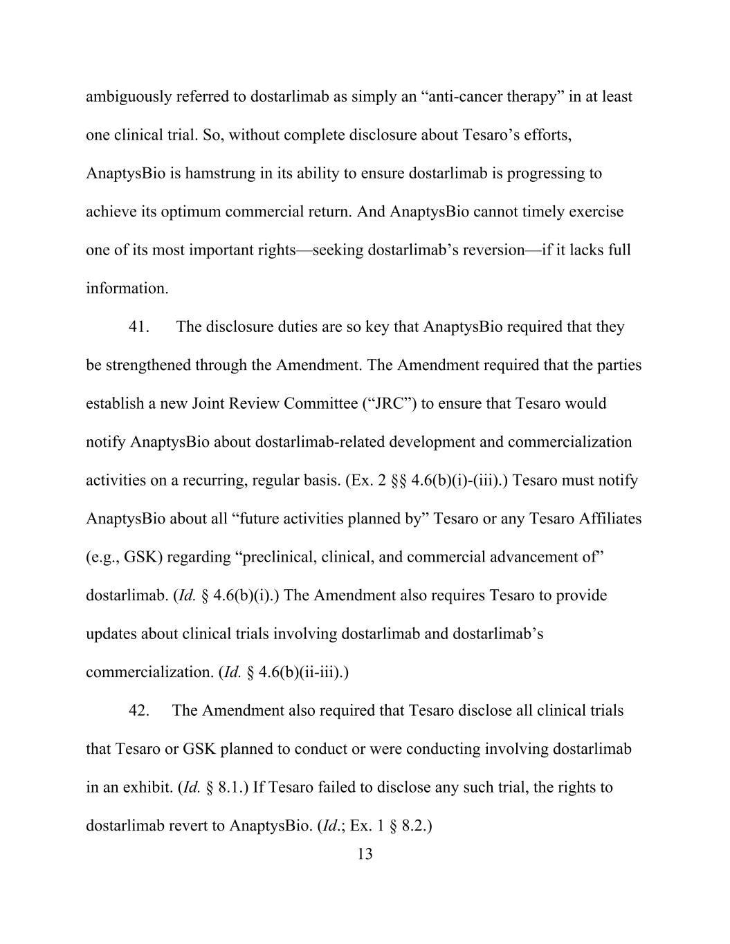 13 ambiguously referred to dostarlimab as simply an “anti-cancer therapy” in at least one clinical trial. So, without complete disclosure about Tesaro’s efforts, AnaptysBio is hamstrung in its ability to ensure dostarlimab is progressing to achieve its optimum commercial return. And AnaptysBio cannot timely exercise one of its most important rights—seeking dostarlimab’s reversion—if it lacks full information. 41. The disclosure duties are so key that AnaptysBio required that they be strengthened through the Amendment. The Amendment required that the parties establish a new Joint Review Committee (“JRC”) to ensure that Tesaro would notify AnaptysBio about dostarlimab-related development and commercialization activities on a recurring, regular basis. (Ex. 2 §§ 4.6(b)(i)-(iii).) Tesaro must notify AnaptysBio about all “future activities planned by” Tesaro or any Tesaro Affiliates (e.g., GSK) regarding “preclinical, clinical, and commercial advancement of” dostarlimab. (Id. § 4.6(b)(i).) The Amendment also requires Tesaro to provide updates about clinical trials involving dostarlimab and dostarlimab’s commercialization. (Id. § 4.6(b)(ii-iii).) 42. The Amendment also required that Tesaro disclose all clinical trials that Tesaro or GSK planned to conduct or were conducting involving dostarlimab in an exhibit. (Id. § 8.1.) If Tesaro failed to disclose any such trial, the rights to dostarlimab revert to AnaptysBio. (Id.; Ex. 1 § 8.2.)