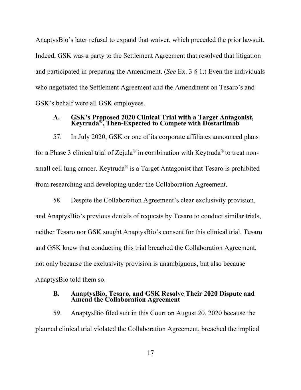 17 AnaptysBio’s later refusal to expand that waiver, which preceded the prior lawsuit. Indeed, GSK was a party to the Settlement Agreement that resolved that litigation and participated in preparing the Amendment. (See Ex. 3 § 1.) Even the individuals who negotiated the Settlement Agreement and the Amendment on Tesaro’s and GSK’s behalf were all GSK employees. A. GSK’s Proposed 2020 Clinical Trial with a Target Antagonist, Keytruda®, Then-Expected to Compete with Dostarlimab 57. In July 2020, GSK or one of its corporate affiliates announced plans for a Phase 3 clinical trial of Zejula® in combination with Keytruda® to treat non- small cell lung cancer. Keytruda® is a Target Antagonist that Tesaro is prohibited from researching and developing under the Collaboration Agreement. 58. Despite the Collaboration Agreement’s clear exclusivity provision, and AnaptysBio’s previous denials of requests by Tesaro to conduct similar trials, neither Tesaro nor GSK sought AnaptysBio’s consent for this clinical trial. Tesaro and GSK knew that conducting this trial breached the Collaboration Agreement, not only because the exclusivity provision is unambiguous, but also because AnaptysBio told them so. B. AnaptysBio, Tesaro, and GSK Resolve Their 2020 Dispute and Amend the Collaboration Agreement 59. AnaptysBio filed suit in this Court on August 20, 2020 because the planned clinical trial violated the Collaboration Agreement, breached the implied