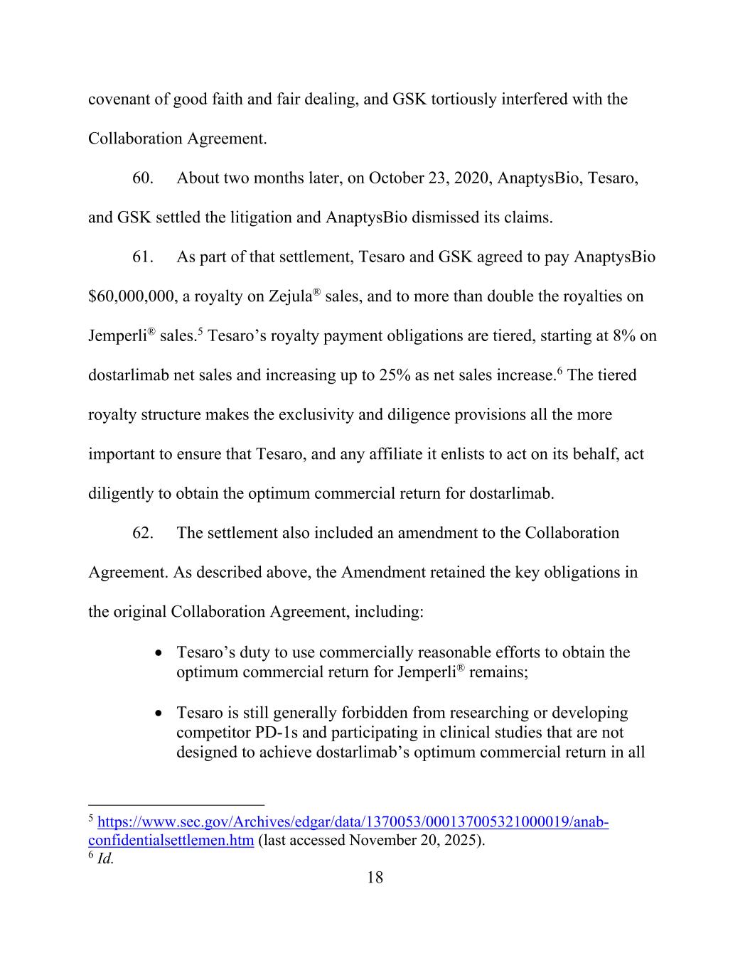 18 covenant of good faith and fair dealing, and GSK tortiously interfered with the Collaboration Agreement. 60. About two months later, on October 23, 2020, AnaptysBio, Tesaro, and GSK settled the litigation and AnaptysBio dismissed its claims. 61. As part of that settlement, Tesaro and GSK agreed to pay AnaptysBio $60,000,000, a royalty on Zejula® sales, and to more than double the royalties on Jemperli® sales.5 Tesaro’s royalty payment obligations are tiered, starting at 8% on dostarlimab net sales and increasing up to 25% as net sales increase.6 The tiered royalty structure makes the exclusivity and diligence provisions all the more important to ensure that Tesaro, and any affiliate it enlists to act on its behalf, act diligently to obtain the optimum commercial return for dostarlimab. 62. The settlement also included an amendment to the Collaboration Agreement. As described above, the Amendment retained the key obligations in the original Collaboration Agreement, including: Tesaro’s duty to use commercially reasonable efforts to obtain the optimum commercial return for Jemperli® remains; Tesaro is still generally forbidden from researching or developing competitor PD-1s and participating in clinical studies that are not designed to achieve dostarlimab’s optimum commercial return in all 5 https://www.sec.gov/Archives/edgar/data/1370053/000137005321000019/anab- confidentialsettlemen.htm (last accessed November 20, 2025). 6 Id.