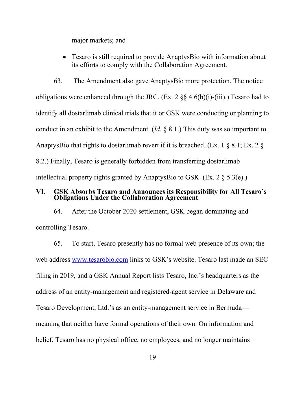 19 major markets; and Tesaro is still required to provide AnaptysBio with information about its efforts to comply with the Collaboration Agreement. 63. The Amendment also gave AnaptysBio more protection. The notice obligations were enhanced through the JRC. (Ex. 2 §§ 4.6(b)(i)-(iii).) Tesaro had to identify all dostarlimab clinical trials that it or GSK were conducting or planning to conduct in an exhibit to the Amendment. (Id. § 8.1.) This duty was so important to AnaptysBio that rights to dostarlimab revert if it is breached. (Ex. 1 § 8.1; Ex. 2 § 8.2.) Finally, Tesaro is generally forbidden from transferring dostarlimab intellectual property rights granted by AnaptysBio to GSK. (Ex. 2 § 5.3(e).) VI. GSK Absorbs Tesaro and Announces its Responsibility for All Tesaro’s Obligations Under the Collaboration Agreement 64. After the October 2020 settlement, GSK began dominating and controlling Tesaro. 65. To start, Tesaro presently has no formal web presence of its own; the web address www.tesarobio.com links to GSK’s website. Tesaro last made an SEC filing in 2019, and a GSK Annual Report lists Tesaro, Inc.’s headquarters as the address of an entity-management and registered-agent service in Delaware and Tesaro Development, Ltd.’s as an entity-management service in Bermuda— meaning that neither have formal operations of their own. On information and belief, Tesaro has no physical office, no employees, and no longer maintains