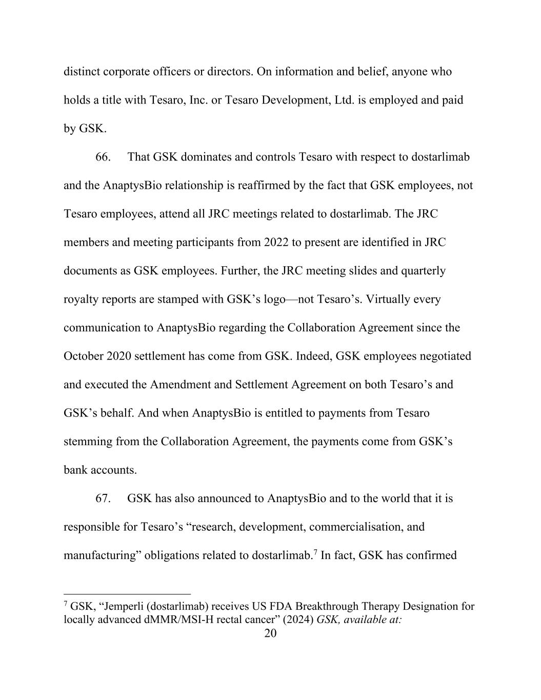 20 distinct corporate officers or directors. On information and belief, anyone who holds a title with Tesaro, Inc. or Tesaro Development, Ltd. is employed and paid by GSK. 66. That GSK dominates and controls Tesaro with respect to dostarlimab and the AnaptysBio relationship is reaffirmed by the fact that GSK employees, not Tesaro employees, attend all JRC meetings related to dostarlimab. The JRC members and meeting participants from 2022 to present are identified in JRC documents as GSK employees. Further, the JRC meeting slides and quarterly royalty reports are stamped with GSK’s logo—not Tesaro’s. Virtually every communication to AnaptysBio regarding the Collaboration Agreement since the October 2020 settlement has come from GSK. Indeed, GSK employees negotiated and executed the Amendment and Settlement Agreement on both Tesaro’s and GSK’s behalf. And when AnaptysBio is entitled to payments from Tesaro stemming from the Collaboration Agreement, the payments come from GSK’s bank accounts. 67. GSK has also announced to AnaptysBio and to the world that it is responsible for Tesaro’s “research, development, commercialisation, and manufacturing” obligations related to dostarlimab.7 In fact, GSK has confirmed 7 GSK, “Jemperli (dostarlimab) receives US FDA Breakthrough Therapy Designation for locally advanced dMMR/MSI-H rectal cancer” (2024) GSK, available at: