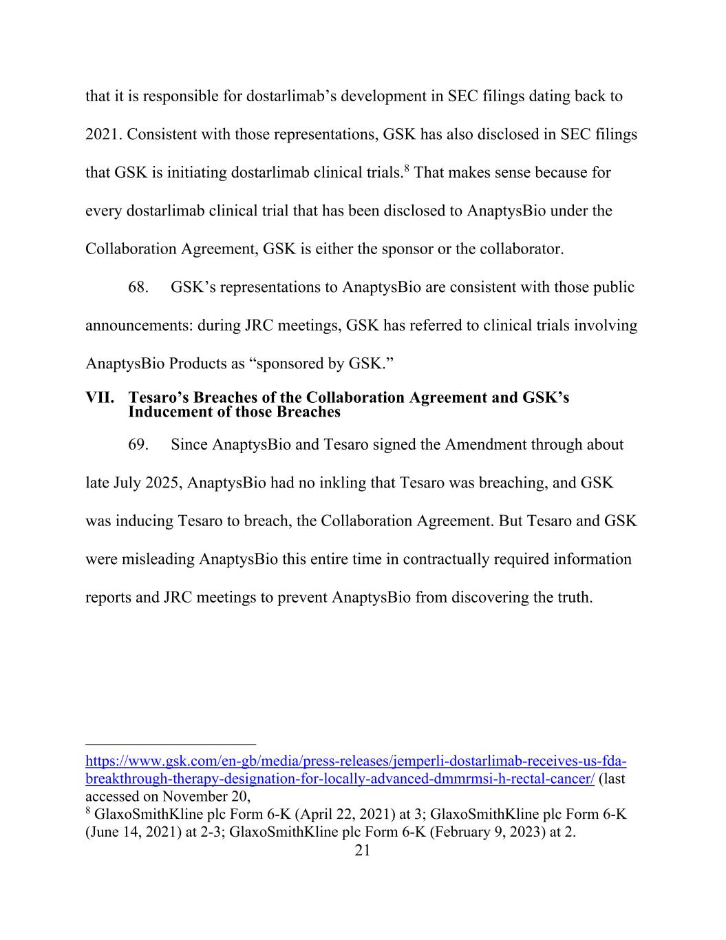 21 that it is responsible for dostarlimab’s development in SEC filings dating back to 2021. Consistent with those representations, GSK has also disclosed in SEC filings that GSK is initiating dostarlimab clinical trials.8 That makes sense because for every dostarlimab clinical trial that has been disclosed to AnaptysBio under the Collaboration Agreement, GSK is either the sponsor or the collaborator. 68. GSK’s representations to AnaptysBio are consistent with those public announcements: during JRC meetings, GSK has referred to clinical trials involving AnaptysBio Products as “sponsored by GSK.” VII. Tesaro’s Breaches of the Collaboration Agreement and GSK’s Inducement of those Breaches 69. Since AnaptysBio and Tesaro signed the Amendment through about late July 2025, AnaptysBio had no inkling that Tesaro was breaching, and GSK was inducing Tesaro to breach, the Collaboration Agreement. But Tesaro and GSK were misleading AnaptysBio this entire time in contractually required information reports and JRC meetings to prevent AnaptysBio from discovering the truth. https://www.gsk.com/en-gb/media/press-releases/jemperli-dostarlimab-receives-us-fda- breakthrough-therapy-designation-for-locally-advanced-dmmrmsi-h-rectal-cancer/ (last accessed on November 20, 8 GlaxoSmithKline plc Form 6-K (April 22, 2021) at 3; GlaxoSmithKline plc Form 6-K (June 14, 2021) at 2-3; GlaxoSmithKline plc Form 6-K (February 9, 2023) at 2.