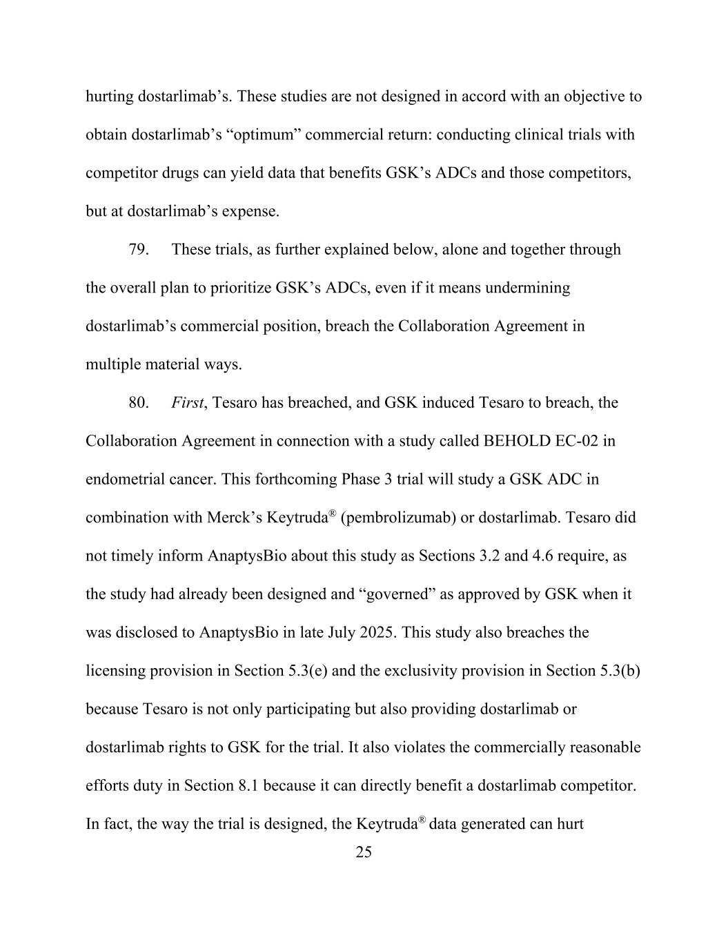 25 hurting dostarlimab’s. These studies are not designed in accord with an objective to obtain dostarlimab’s “optimum” commercial return: conducting clinical trials with competitor drugs can yield data that benefits GSK’s ADCs and those competitors, but at dostarlimab’s expense. 79. These trials, as further explained below, alone and together through the overall plan to prioritize GSK’s ADCs, even if it means undermining dostarlimab’s commercial position, breach the Collaboration Agreement in multiple material ways. 80. First, Tesaro has breached, and GSK induced Tesaro to breach, the Collaboration Agreement in connection with a study called BEHOLD EC-02 in endometrial cancer. This forthcoming Phase 3 trial will study a GSK ADC in combination with Merck’s Keytruda® (pembrolizumab) or dostarlimab. Tesaro did not timely inform AnaptysBio about this study as Sections 3.2 and 4.6 require, as the study had already been designed and “governed” as approved by GSK when it was disclosed to AnaptysBio in late July 2025. This study also breaches the licensing provision in Section 5.3(e) and the exclusivity provision in Section 5.3(b) because Tesaro is not only participating but also providing dostarlimab or dostarlimab rights to GSK for the trial. It also violates the commercially reasonable efforts duty in Section 8.1 because it can directly benefit a dostarlimab competitor. In fact, the way the trial is designed, the Keytruda® data generated can hurt