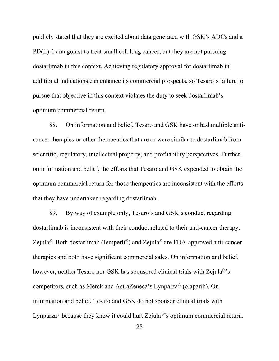 28 publicly stated that they are excited about data generated with GSK’s ADCs and a PD(L)-1 antagonist to treat small cell lung cancer, but they are not pursuing dostarlimab in this context. Achieving regulatory approval for dostarlimab in additional indications can enhance its commercial prospects, so Tesaro’s failure to pursue that objective in this context violates the duty to seek dostarlimab’s optimum commercial return. 88. On information and belief, Tesaro and GSK have or had multiple anti- cancer therapies or other therapeutics that are or were similar to dostarlimab from scientific, regulatory, intellectual property, and profitability perspectives. Further, on information and belief, the efforts that Tesaro and GSK expended to obtain the optimum commercial return for those therapeutics are inconsistent with the efforts that they have undertaken regarding dostarlimab. 89. By way of example only, Tesaro’s and GSK’s conduct regarding dostarlimab is inconsistent with their conduct related to their anti-cancer therapy, Zejula®. Both dostarlimab (Jemperli®) and Zejula® are FDA-approved anti-cancer therapies and both have significant commercial sales. On information and belief, however, neither Tesaro nor GSK has sponsored clinical trials with Zejula®’s competitors, such as Merck and AstraZeneca’s Lynparza® (olaparib). On information and belief, Tesaro and GSK do not sponsor clinical trials with Lynparza® because they know it could hurt Zejula®’s optimum commercial return.