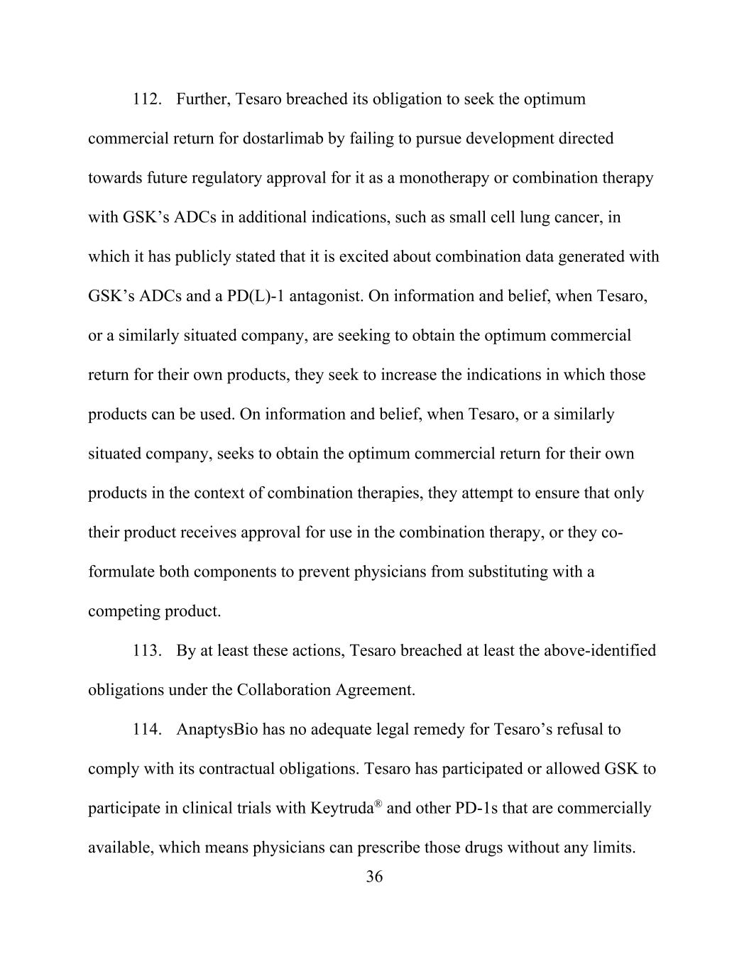 36 112. Further, Tesaro breached its obligation to seek the optimum commercial return for dostarlimab by failing to pursue development directed towards future regulatory approval for it as a monotherapy or combination therapy with GSK’s ADCs in additional indications, such as small cell lung cancer, in which it has publicly stated that it is excited about combination data generated with GSK’s ADCs and a PD(L)-1 antagonist. On information and belief, when Tesaro, or a similarly situated company, are seeking to obtain the optimum commercial return for their own products, they seek to increase the indications in which those products can be used. On information and belief, when Tesaro, or a similarly situated company, seeks to obtain the optimum commercial return for their own products in the context of combination therapies, they attempt to ensure that only their product receives approval for use in the combination therapy, or they co- formulate both components to prevent physicians from substituting with a competing product. 113. By at least these actions, Tesaro breached at least the above-identified obligations under the Collaboration Agreement. 114. AnaptysBio has no adequate legal remedy for Tesaro’s refusal to comply with its contractual obligations. Tesaro has participated or allowed GSK to participate in clinical trials with Keytruda® and other PD-1s that are commercially available, which means physicians can prescribe those drugs without any limits.