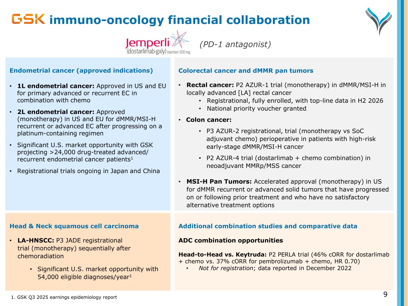 Actuals 1. Actual Jemperli Q2 to Q3’25 QoQ growth was 16%, Forecast assumes illustrative constant ~10% QoQ sales growth from Q3’25 through Q2’27 and dMMR rectal approval; 2. GSK analyst consensus as of 11/26/2025 (solid blue), 9/15/2025 (dark dashed blue), and 11/26/2024 (light dashed blue) converted from GBP to USD using Q3 2025 average exchange rate (1.35x), GSK Analyst Consensus website; 3. CEO Emma Walmsley, 2025 JP Morgan CEO Series fireside chat, 9/11/2025, “there's no change to our peak year sales overall ambition for Jemperli, that's for sure, which is far more than £2 billion.” Jemperli on a steep growth trajectory with GSK guiding to greater than £2 billion ($2.7 billion) peak monotherapy sales 8 Jemperli Revenue Forecasts $28 $176 $598 $1,121 $1,440 $1,697 $1,895 $2,028 $2,130 $2,194 $17 $105 $249 $382 $576 $600 $1,118 $1,702 $251 $491 $600 $0 $500 $1,000 $1,500 $2,000 $2,500 $3,000 2022 2023 2024 2025 2026 2027 2028 2029 2030 2031 S a le s ( in U S D m il li o n s ) Legend Legend Illustrative constant ~10% QoQ growth1 WS Nov. 25/Sept. 25/Nov. 24 consensus forecast2 Sagard paydown: Constant ~10% QoQ growth Sagard paydown: WS Nov. 25 consensus Nov ’25: GSK sell-side consensus2 Sept. ’25: GSK sell-side consensus2 Nov. ’24: GSK sell-side consensus2 Sagard paydown expected between Q2 2027 (10% QoQ growth) or Q1 2028 (WS consensus as of Nov. ‘25) GSK Peak Revenue Guidance >$2.7 billion3