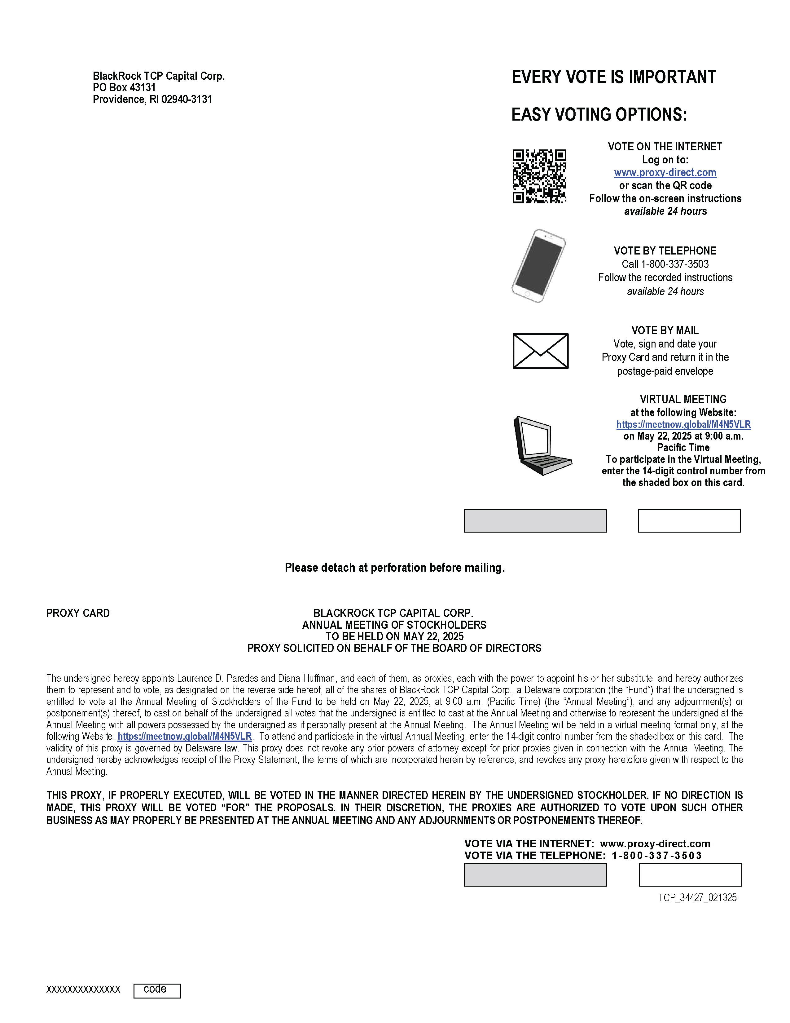 This proxy statement (the “Proxy Statement”) is furnished in connection with the solicitation of proxies by the Board of Directors (the “Board of Directors”) of BlackRock TCP Capital Corp., a Delaware corporation (the “Company”), for use at the 2025 Annual Meeting of Stockholders (the “Annual Meeting”) of the Company to be held on May 22, 2025, at 9:00 a.m. Pacific Time, and at any postponements, adjournments or delays thereof. Stockholders will not have to travel to attend the Annual Meeting but will be able to view the Annual Meeting live and cast their votes by accessing a web link. However, stockholders will have the same rights in the virtual meeting as they would in in-person meetings. To attend the Annual Meeting please follow the directions below and use the following link: meetnow.global/M4N5VLR.