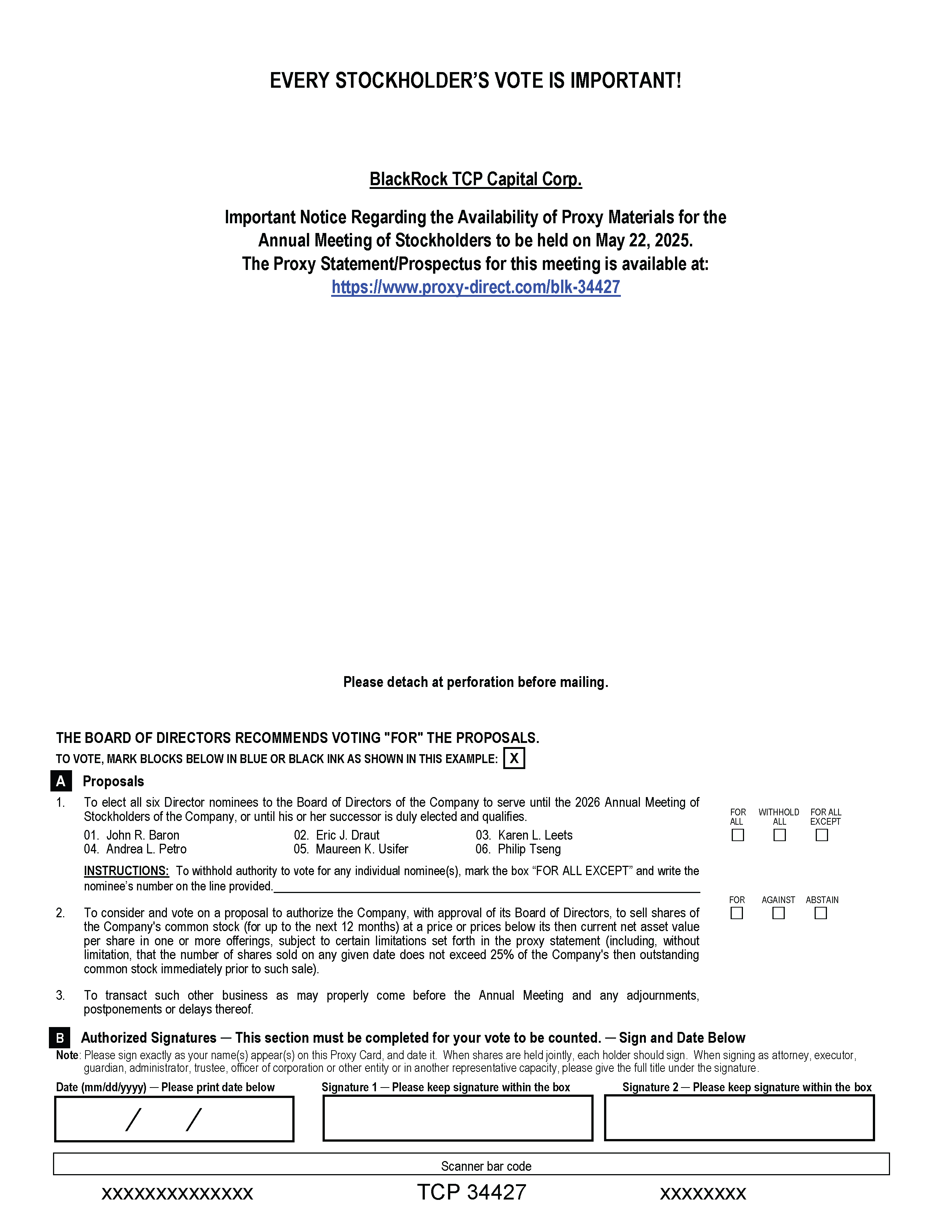 You are cordially invited to attend the 2025 Annual Meeting of Stockholders (the “Annual Meeting”) of BlackRock TCP Capital Corp., a Delaware corporation (the “Company”), to be held on May 22, 2025, at 9:00 a.m., Pacific Time, to consider and vote on the proposals discussed in the enclosed proxy statement. The Annual Meeting will be held in a virtual meeting format only. Stockholders will not have to travel to attend the Annual Meeting but will be able to view the Annual Meeting live and cast their votes by accessing a web link. To participate in the Annual Meeting please follow the directions in the notice of Annual Meeting and proxy statement accompanying this letter and use the following link: meetnow.global/M4N5VLR.