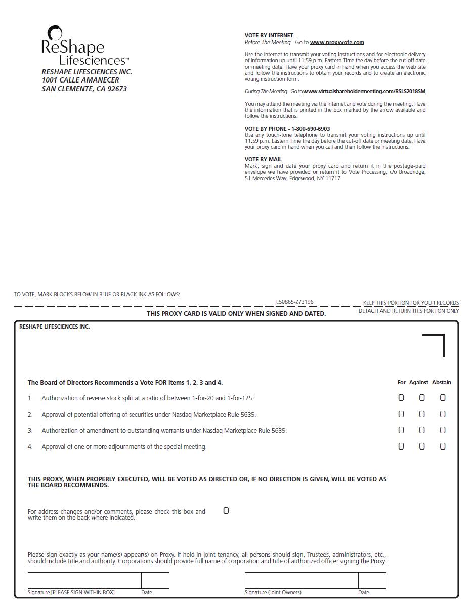 VOTE BY INTERNET Before The Meeting - Go to www.proxyvote.com Use the Internet to transmit your voting instructions and for electronic delivery of information up until 11:59 p.m. Eastern Time the day before the cut-off date or meeting date. Have your proxy card in hand when you access the web site and follow the instructions to obtain your records and to create an electronic voting instruction form. RESHAPE LIFESCIENCES INC. 1001 CALLE AMANECER SAN CLEMENTE, CA 92673 During The Meeting - Go to www.virtualshareholdermeeting.com/RSLS2018SM You may attend the meeting via the Internet and vote during the meeting. Have the information that is printed in the box marked by the arrow available and follow the instructions. VOTE BY PHONE - 1-800-690-6903 Use any touch-tone telephone to transmit your voting instructions up until 11:59 p.m. Eastern Time the day before the cut-off date or meeting date. Have your proxy card in hand when you call and then follow the instructions. VOTE BY MAIL Mark, sign and date your proxy card and return it in the postage-paid envelope we have provided or return it to Vote Processing, c/o Broadridge, 51 Mercedes Way, Edgewood, NY 11717. TO VOTE, MARK BLOCKS BELOW IN BLUE OR BLACK INK AS FOLLOWS: E50865-Z73196 KEEP THIS PORTION FOR YOUR RECORDS DETACH AND RETURN THIS PORTION ONLY THIS PROXY CARD IS VALID ONLY WHEN SIGNED AND DATED. RESHAPE LIFESCIENCES INC. The Board of Directors Recommends a Vote FOR Items 1, 2, 3 and 4. For Against Abstain ! ! ! ! ! ! ! ! ! ! ! ! 1. Authorization of reverse stock split at a ratio of between 1-for-20 and 1-for-125. 2. Approval of potential offering of securities under Nasdaq Marketplace Rule 5635. 3. Authorization of amendment to outstanding warrants under Nasdaq Marketplace Rule 5635. 4. Approval of one or more adjournments of the special meeting. THIS PROXY, WHEN PROPERLY EXECUTED, WILL BE VOTED AS DIRECTED OR, IF NO DIRECTION IS GIVEN, WILL BE VOTED AS THE BOARD RECOMMENDS. ! For address changes and/or comments, please check this box and write them on the back where indicated. Please sign exactly as your name(s) appear(s) on Proxy. If held in joint tenancy, all persons should sign. Trustees, administrators, etc., should include title and authority. Corporations should provide full name of corporation and title of authorized officer signing the Proxy. Signature [PLEASE SIGN WITHIN BOX] Date Signature (Joint Owners) Date