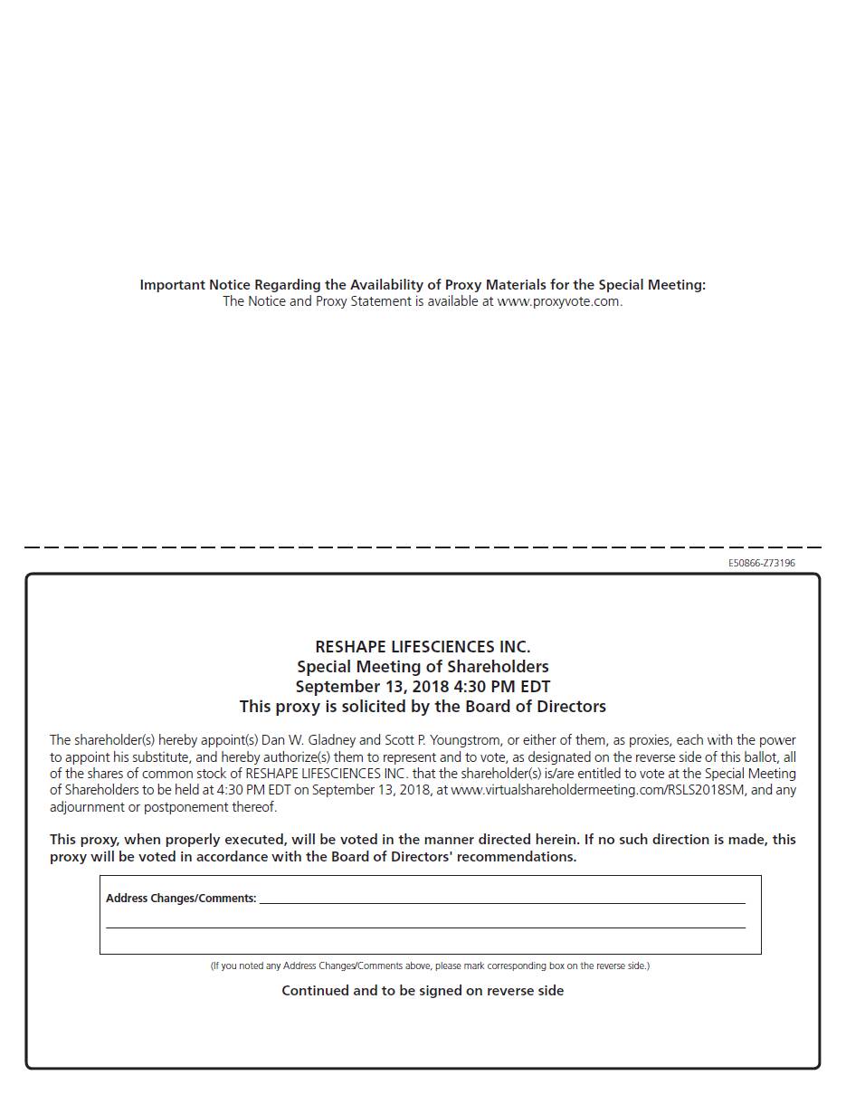 Important Notice Regarding the Availability of Proxy Materials for the Special Meeting: The Notice and Proxy Statement is available at www.proxyvote.com. E50866-Z73196 RESHAPE LIFESCIENCES INC. Special Meeting of Shareholders September 13, 2018 4:30 PM EDT This proxy is solicited by the Board of Directors The shareholder(s) hereby appoint(s) Dan W. Gladney and Scott P. Youngstrom, or either of them, as proxies, each with the power to appoint his substitute, and hereby authorize(s) them to represent and to vote, as designated on the reverse side of this ballot, all of the shares of common stock of RESHAPE LIFESCIENCES INC. that the shareholder(s) is/are entitled to vote at the Special Meeting of Shareholders to be held at 4:30 PM EDT on September 13, 2018, at www.virtualshareholdermeeting.com/RSLS2018SM, and any adjournment or postponement thereof. This proxy, when properly executed, will be voted in the manner directed herein. If no such direction is made, this proxy will be voted in accordance with the Board of Directors' recommendations. (If you noted any Address Changes/Comments above, please mark corresponding box on the reverse side.) Continued and to be signed on reverse side Address Changes/Comments: