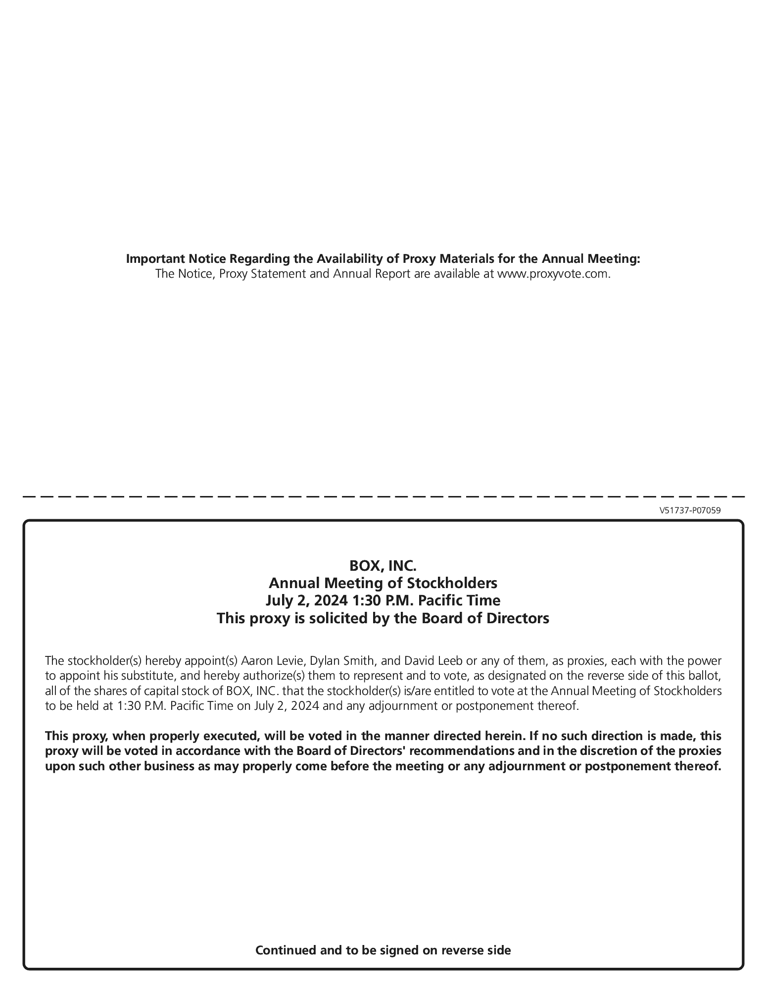 • | by attending the Annual Meeting by visiting http://www.virtualshareholdermeeting.com/BOX2024, where stockholders may vote and submit questions during the meeting (have your Notice or proxy card in hand when you visit the website). |