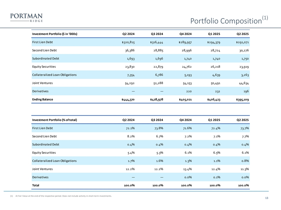 (1) Portfolio Composition Investment Portfolio ($ in ‘000s) Q2 2024 Q3 2024 Q4 2024 Q1 2025 Q2 2025 First Lien Debt $320,815 $316,444 $289,957 $294,379 $291,071 Second Lien Debt 36,386 28,885 28,996 28,724 30,276 Subordinated Debt 1,693 1,696 1,740 1,740 1,750 Equity Securities 23,830 22,879 24,762 26,218 23,919 Collateralized Loan Obligations 7,354 6,786 5,193 4,639 3,263 Joint Ventures 54,292 52,288 54,153 50,491 44,634 Derivatives — — 220 232 196 Ending Balance $444,370 $428,978 $405,021 $406,423 $395,109 Investment Portfolio (% of total) Q2 2024 Q3 2024 Q4 2024 Q1 2025 Q2 2025 First Lien Debt 72.1% 73.8% 71.6% 72.4% 73.7% Second Lien Debt 8.2% 6.7% 7.2% 7.1% 7.7% Subordinated Debt 0.4% 0.4% 0.4% 0.4% 0.4% Equity Securities 5.4% 5.3% 6.1% 6.5% 6.1% Collateralized Loan Obligations 1.7% 1.6% 1.3% 1.1% 0.8% Joint Ventures 12.2% 12.2% 13.4% 12.4% 11.3% Derivatives — — 0.0% 0.1% 0.0% Total 100.0% 100.0% 100.0% 100.0% 100.0% (1) At Fair Value at the end of the respective period. Does not include activity in short-term investments. 13