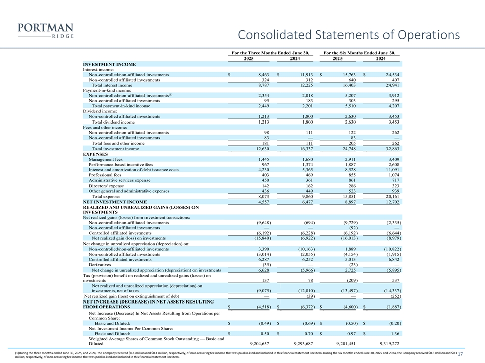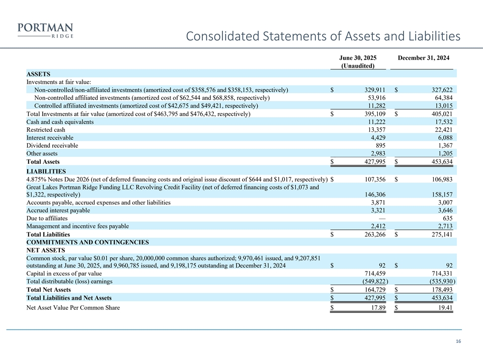 Consolidated Statements of Assets and Liabilities June 30, 2025 December 31, 2024 (Unaudited) ASSETS Investments at fair value: Non-controlled/non-affiliated investments (amortized cost of $358,576 and $358,153, respectively) $ 329,911 $ 327,622 Non-controlled affiliated investments (amortized cost of $62,544 and $68,858, respectively) 53,916 64,384 Controlled affiliated investments (amortized cost of $42,675 and $49,421, respectively) 11,282 13,015 Total Investments at fair value (amortized cost of $463,795 and $476,432, respectively) $ 395,109 $ 405,021 Cash and cash equivalents 11,222 17,532 Restricted cash 13,357 22,421 Interest receivable 4,429 6,088 Dividend receivable 895 1,367 Other assets 2,983 1,205 Total Assets $ 427,995 $ 453,634 LIABILITIES 4.875% Notes Due 2026 (net of deferred financing costs and original issue discount of $644 and $1,017, respectively) $ 107,356 $ 106,983 Great Lakes Portman Ridge Funding LLC Revolving Credit Facility (net of deferred financing costs of $1,073 and $1,322, respectively) 146,306 158,157 Accounts payable, accrued expenses and other liabilities 3,871 3,007 Accrued interest payable 3,321 3,646 Due to affiliates — 635 Management and incentive fees payable 2,412 2,713 Total Liabilities $ 263,266 $ 275,141 COMMITMENTS AND CONTINGENCIES NET ASSETS Common stock, par value $0.01 per share, 20,000,000 common shares authorized; 9,970,461 issued, and 9,207,851 outstanding at June 30, 2025, and 9,960,785 issued, and 9,198,175 outstanding at December 31, 2024 $ 92 $ 92 Capital in excess of par value 714,459 714,331 Total distributable (loss) earnings (549,822 ) (535,930 ) Total Net Assets $ 164,729 $ 178,493 Total Liabilities and Net Assets $ 427,995 $ 453,634 Net Asset Value Per Common Share $ 17.89 $ 19.41 16