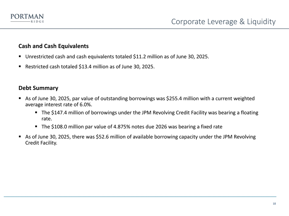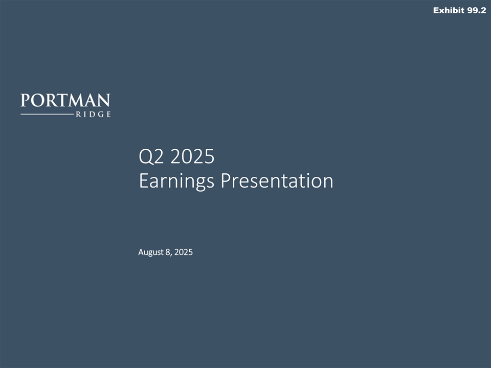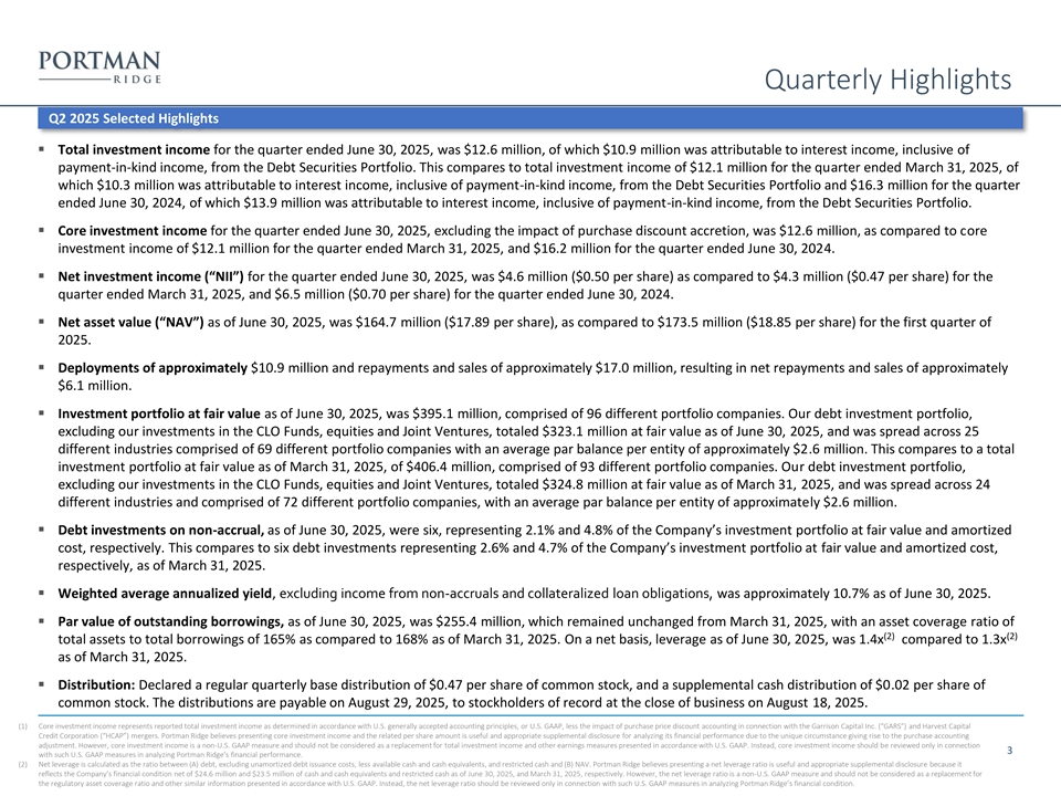 Quarterly Highlights Q2 2025 Selected Highlights ▪ Total investment income for the quarter ended June 30, 2025, was $12.6 million, of which $10.9 million was attributable to interest income, inclusive of payment-in-kind income, from the Debt Securities Portfolio. This compares to total investment income of $12.1 million for the quarter ended March 31, 2025, of which $10.3 million was attributable to interest income, inclusive of payment-in-kind income, from the Debt Securities Portfolio and $16.3 million for the quarter ended June 30, 2024, of which $13.9 million was attributable to interest income, inclusive of payment-in-kind income, from the Debt Securities Portfolio. ▪ Core investment income for the quarter ended June 30, 2025, excluding the impact of purchase discount accretion, was $12.6 million, as compared to core investment income of $12.1 million for the quarter ended March 31, 2025, and $16.2 million for the quarter ended June 30, 2024. ▪ Net investment income (“NII”) for the quarter ended June 30, 2025, was $4.6 million ($0.50 per share) as compared to $4.3 million ($0.47 per share) for the quarter ended March 31, 2025, and $6.5 million ($0.70 per share) for the quarter ended June 30, 2024. ▪ Net asset value (“NAV”) as of June 30, 2025, was $164.7 million ($17.89 per share), as compared to $173.5 million ($18.85 per share) for the first quarter of 2025. ▪ Deployments of approximately $10.9 million and repayments and sales of approximately $17.0 million, resulting in net repayments and sales of approximately $6.1 million. ▪ Investment portfolio at fair value as of June 30, 2025, was $395.1 million, comprised of 96 different portfolio companies. Our debt investment portfolio, excluding our investments in the CLO Funds, equities and Joint Ventures, totaled $323.1 million at fair value as of June 30, 2025, and was spread across 25 different industries comprised of 69 different portfolio companies with an average par balance per entity of approximately $2.6 million. This compares to a total investment portfolio at fair value as of March 31, 2025, of $406.4 million, comprised of 93 different portfolio companies. Our debt investment portfolio, excluding our investments in the CLO Funds, equities and Joint Ventures, totaled $324.8 million at fair value as of March 31, 2025, and was spread across 24 different industries and comprised of 72 different portfolio companies, with an average par balance per entity of approximately $2.6 million. ▪ Debt investments on non-accrual, as of June 30, 2025, were six, representing 2.1% and 4.8% of the Company’s investment portfolio at fair value and amortized cost, respectively. This compares to six debt investments representing 2.6% and 4.7% of the Company’s investment portfolio at fair value and amortized cost, respectively, as of March 31, 2025. ▪ Weighted average annualized yield, excluding income from non-accruals and collateralized loan obligations, was approximately 10.7% as of June 30, 2025. ▪ Par value of outstanding borrowings, as of June 30, 2025, was $255.4 million, which remained unchanged from March 31, 2025, with an asset coverage ratio of (2) (2) total assets to total borrowings of 165% as compared to 168% as of March 31, 2025. On a net basis, leverage as of June 30, 2025, was 1.4x compared to 1.3x as of March 31, 2025. ▪ Distribution: Declared a regular quarterly base distribution of $0.47 per share of common stock, and a supplemental cash distribution of $0.02 per share of common stock. The distributions are payable on August 29, 2025, to stockholders of record at the close of business on August 18, 2025. (1) Core investment income represents reported total investment income as determined in accordance with U.S. generally accepted accounting principles, or U.S. GAAP, less the impact of purchase price discount accounting in connection with the Garrison Capital Inc. (“GARS”) and Harvest Capital Credit Corporation (“HCAP”) mergers. Portman Ridge believes presenting core investment income and the related per share amount is useful and appropriate supplemental disclosure for analyzing its financial performance due to the unique circumstance giving rise to the purchase accounting adjustment. However, core investment income is a non-U.S. GAAP measure and should not be considered as a replacement for total investment income and other earnings measures presented in accordance with U.S. GAAP. Instead, core investment income should be reviewed only in connection 3 with such U.S. GAAP measures in analyzing Portman Ridge’s financial performance. (2) Net leverage is calculated as the ratio between (A) debt, excluding unamortized debt issuance costs, less available cash and cash equivalents, and restricted cash and (B) NAV. Portman Ridge believes presenting a net leverage ratio is useful and appropriate supplemental disclosure because it reflects the Company’s financial condition net of $24.6 million and $23.5 million of cash and cash equivalents and restricted cash as of June 30, 2025, and March 31, 2025, respectively. However, the net leverage ratio is a non-U.S. GAAP measure and should not be considered as a replacement for the regulatory asset coverage ratio and other similar information presented in accordance with U.S. GAAP. Instead, the net leverage ratio should be reviewed only in connection with such U.S. GAAP measures in analyzing Portman Ridge’s financial condition.