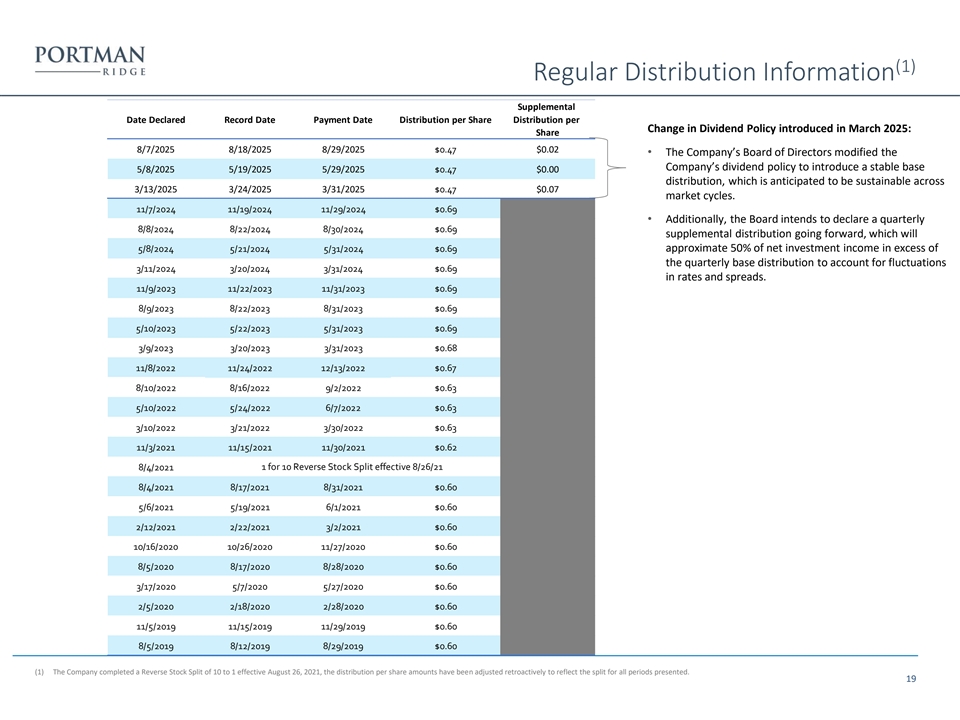 (1) Regular Distribution Information Supplemental Date Declared Record Date Payment Date Distribution per Share Distribution per Change in Dividend Policy introduced in March 2025: Share 8/7/2025 8/18/2025 8/29/2025 $0.47 $0.02 • The Company’s Board of Directors modified the Company’s dividend policy to introduce a stable base 5/8/2025 5/19/2025 5/29/2025 $0.47 $0.00 distribution, which is anticipated to be sustainable across 3/13/2025 3/24/2025 3/31/2025 $0.47 $0.07 market cycles. 11/7/2024 11/19/2024 11/29/2024 $0.69 • Additionally, the Board intends to declare a quarterly 8/8/2024 8/22/2024 8/30/2024 $0.69 supplemental distribution going forward, which will 5/8/2024 5/21/2024 5/31/2024 $0.69 approximate 50% of net investment income in excess of the quarterly base distribution to account for fluctuations 3/11/2024 3/20/2024 3/31/2024 $0.69 in rates and spreads. 11/9/2023 11/22/2023 11/31/2023 $0.69 8/9/2023 8/22/2023 8/31/2023 $0.69 5/10/2023 5/22/2023 5/31/2023 $0.69 3/9/2023 3/20/2023 3/31/2023 $0.68 11/8/2022 11/24/2022 12/13/2022 $0.67 8/10/2022 8/16/2022 9/2/2022 $0.63 5/10/2022 5/24/2022 6/7/2022 $0.63 3/10/2022 3/21/2022 3/30/2022 $0.63 11/3/2021 11/15/2021 11/30/2021 $0.62 8/4/2021 1 for 10 Reverse Stock Split effective 8/26/21 8/4/2021 8/17/2021 8/31/2021 $0.60 5/6/2021 5/19/2021 6/1/2021 $0.60 2/12/2021 2/22/2021 3/2/2021 $0.60 10/16/2020 10/26/2020 11/27/2020 $0.60 8/5/2020 8/17/2020 8/28/2020 $0.60 3/17/2020 5/7/2020 5/27/2020 $0.60 2/5/2020 2/18/2020 2/28/2020 $0.60 11/5/2019 11/15/2019 11/29/2019 $0.60 8/5/2019 8/12/2019 8/29/2019 $0.60 (1) The Company completed a Reverse Stock Split of 10 to 1 effective August 26, 2021, the distribution per share amounts have been adjusted retroactively to reflect the split for all periods presented. 19