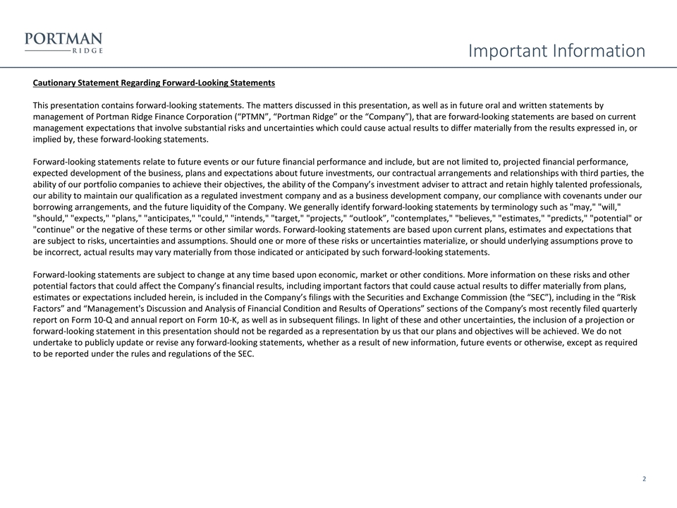 Important Information Cautionary Statement Regarding Forward-Looking Statements This presentation contains forward-looking statements. The matters discussed in this presentation, as well as in future oral and written statements by management of Portman Ridge Finance Corporation (“PTMN”, “Portman Ridge” or the “Company”), that are forward-looking statements are based on current management expectations that involve substantial risks and uncertainties which could cause actual results to differ materially from the results expressed in, or implied by, these forward-looking statements. Forward-looking statements relate to future events or our future financial performance and include, but are not limited to, projected financial performance, expected development of the business, plans and expectations about future investments, our contractual arrangements and relationships with third parties, the ability of our portfolio companies to achieve their objectives, the ability of the Company’s investment adviser to attract and retain highly talented professionals, our ability to maintain our qualification as a regulated investment company and as a business development company, our compliance with covenants under our borrowing arrangements, and the future liquidity of the Company. We generally identify forward-looking statements by terminology such as may, will, should, expects, plans, anticipates, could, intends, target, projects, “outlook”, contemplates, believes, estimates, predicts, potential or continue or the negative of these terms or other similar words. Forward-looking statements are based upon current plans, estimates and expectations that are subject to risks, uncertainties and assumptions. Should one or more of these risks or uncertainties materialize, or should underlying assumptions prove to be incorrect, actual results may vary materially from those indicated or anticipated by such forward-looking statements. Forward-looking statements are subject to change at any time based upon economic, market or other conditions. More information on these risks and other potential factors that could affect the Company’s financial results, including important factors that could cause actual results to differ materially from plans, estimates or expectations included herein, is included in the Company’s filings with the Securities and Exchange Commission (the “SEC”), including in the “Risk Factors” and “Management's Discussion and Analysis of Financial Condition and Results of Operations” sections of the Company’s most recently filed quarterly report on Form 10-Q and annual report on Form 10-K, as well as in subsequent filings. In light of these and other uncertainties, the inclusion of a projection or forward-looking statement in this presentation should not be regarded as a representation by us that our plans and objectives will be achieved. We do not undertake to publicly update or revise any forward-looking statements, whether as a result of new information, future events or otherwise, except as required to be reported under the rules and regulations of the SEC. 2