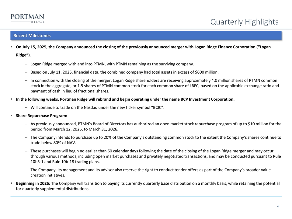 Quarterly Highlights Recent Milestones ▪ On July 15, 2025, the Company announced the closing of the previously announced merger with Logan Ridge Finance Corporation (“Logan Ridge”). – Logan Ridge merged with and into PTMN, with PTMN remaining as the surviving company. – Based on July 11, 2025, financial data, the combined company had total assets in excess of $600 million. – In connection with the closing of the merger, Logan Ridge shareholders are receiving approximately 4.0 million shares of PTMN common stock in the aggregate, or 1.5 shares of PTMN common stock for each common share of LRFC, based on the applicable exchange ratio and payment of cash in lieu of fractional shares. ▪ In the following weeks, Portman Ridge will rebrand and begin operating under the name BCP Investment Corporation. – Will continue to trade on the Nasdaq under the new ticker symbol “BCIC”. ▪ Share Repurchase Program: – As previously announced, PTMN’s Board of Directors has authorized an open market stock repurchase program of up to $10 million for the period from March 12, 2025, to March 31, 2026. – The Company intends to purchase up to 20% of the Company’s outstanding common stock to the extent the Company’s shares continue to trade below 80% of NAV. – These purchases will begin no earlier than 60 calendar days following the date of the closing of the Logan Ridge merger and may occur through various methods, including open market purchases and privately negotiated transactions, and may be conducted pursuant to Rule 10b5-1 and Rule 10b-18 trading plans. – The Company, its management and its adviser also reserve the right to conduct tender offers as part of the Company’s broader value creation initiatives. ▪ Beginning in 2026: The Company will transition to paying its currently quarterly base distribution on a monthly basis, while retaining the potential for quarterly supplemental distributions. 4
