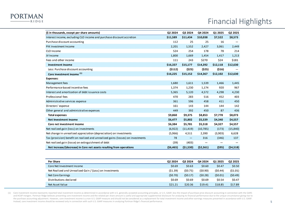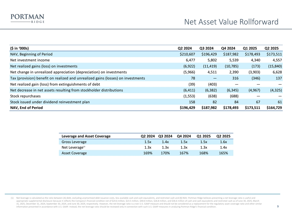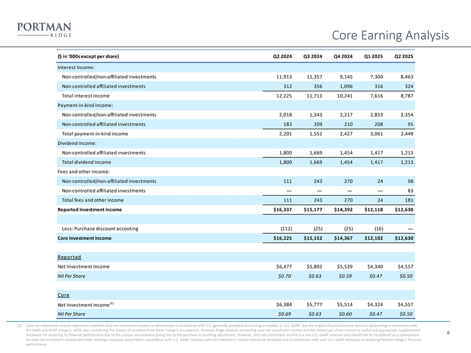 Core Earning Analysis ($ in ‘000s except per share) Q2 2024 Q3 2024 Q4 2024 Q1 2025 Q2 2025 Interest Income: Non-controlled/non-affiliated investments 11,913 11,357 9,145 7,300 8,463 Non-controlled affiliated investments 312 356 1,096 316 324 Total interest income 12,225 11,713 10,241 7,616 8,787 Payment-in-kind income: Non-controlled/non-affiliated investments 2,018 1,343 2,217 2,853 2,354 Non-controlled affiliated investments 183 209 210 208 95 Total payment-in-kind income 2,201 1,552 2,427 3,061 2,449 Dividend income: Non-controlled affiliated investments 1,800 1,669 1,454 1,417 1,213 Total dividend income 1,800 1,669 1,454 1,417 1,213 Fees and other income: Non-controlled/non-affiliated investments 111 243 270 24 98 Non-controlled affiliated investments 83 — — — — Total fees and other income 111 243 270 24 181 Reported Investment Income $16,337 $15,177 $14,392 $12,118 $12,630 Less: Purchase discount accouting (112) (25) (25) (16) — Core Investment Income $16,225 $15,152 $14,367 $12,102 $12,630 Report ed Net Investment Income $6,477 $5,802 $5,539 $4,340 $4,557 NII Per Share $0.70 $0.63 $0.59 $0.47 $0.50 Core (1) Net Investment Income $6,384 $5,777 $5,514 $4,324 $4,557 NII Per Share $0.69 $0.63 $0.60 $0.47 $0.50 (1) Core net investment income represents reported total net investment income as determined in accordance with U.S. generally accepted accounting principles, or U.S. GAAP, less the impact of purchase price discount accounting in connection with the GARS and HCAP mergers, while also considering the impact of accretion from these mergers on expenses. Portman Ridge believes presenting core net investment income and the related per share amount is useful and appropriate supplemental 8 disclosure for analyzing its financial performance due to the unique circumstance giving rise to the purchase accounting adjustment. However, core net investment income is a non-U.S. GAAP measure and should not be considered as a replacement for total net investment income and other earnings measures presented in accordance with U.S. GAAP. Instead, core net investment income should be reviewed only in connection with such U.S. GAAP measures in analyzing Portman Ridge’s financial performance.