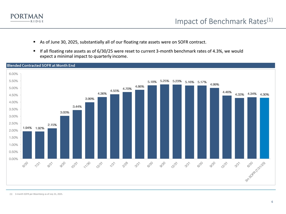 (1) Impact of Benchmark Rates ▪ As of June 30, 2025, substantially all of our floating rate assets were on SOFR contract. ▪ If all floating rate assets as of 6/30/25 were reset to current 3-month benchmark rates of 4.3%, we would expect a minimal impact to quarterly income. (1) (1) 3-month SOFR per Bloomberg as of July 31, 2025. 6