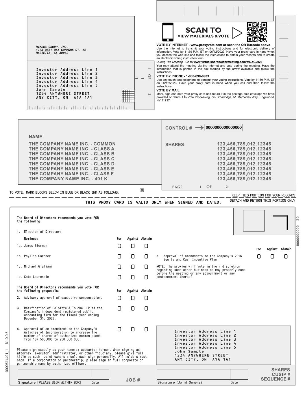11 12345678 12345678 12345678 12345678 12345678 12345678 12345678 12345678 NAME THE COMPANY NAME INC. - COMMON 123,456,789,012.12345 THE COMPANY NAME INC. - CLASS A 123,456,789,012.12345 THE COMPANY NAME INC. - CLASS B 123,456,789,012.12345 THE COMPANY NAME INC. - CLASS C 123,456,789,012.12345 THE COMPANY NAME INC. - CLASS D 123,456,789,012.12345 THE COMPANY NAME INC. - CLASS E 123,456,789,012.12345 THE COMPANY NAME INC. - CLASS F 123,456,789,012.12345 THE COMPANY NAME INC. - 401 K 123,456,789,012.12345 → x 0 2 0 0 0 0 0 0 0 0 0 0 JOB # 1 O F 2 1 OF 2PAGE SHARES CUSIP # SEQUENCE # THIS PROXY CARD IS VALID ONLY WHEN SIGNED AND DATED. KEEP THIS PORTION FOR YOUR RECORDS DETACH AND RETURN THIS PORTION ONLY TO VOTE, MARK BLOCKS BELOW IN BLUE OR BLACK INK AS FOLLOWS: Signature (Joint Owners)Signature [PLEASE SIGN WITHIN BOX] DateDate CONTROL # SHARES SCAN TO VIEW MATERIALS & VOTE 0 0 0 0 0 0 0 0 0 0 0 0 0 0 0 0 0 0 0 0 0 0 0 0 00 00 61 44 91 _1 R 1. 0. 0. 6 MIMEDX GROUP, INC. 1775 WEST OAK COMMONS CT. NE MARIETTA, GA 30062 Investor Address Line 1 Investor Address Line 2 Investor Address Line 3 Investor Address Line 4 Investor Address Line 5 John Sample 1234 ANYWHERE STREET ANY CITY, ON A1A 1A1 Investor Address Line 1 Investor Address Line 2 Investor Address Line 3 Investor Address Line 4 Investor Address Line 5 John Sample 1234 ANYWHERE STREET ANY CITY, ON A1A 1A1 VOTE BY INTERNET - www.proxyvote.com or scan the QR Barcode above Use the Internet to transmit your voting instructions and for electronic delivery of information. Vote by 11:59 P.M. ET on 06/12/2023. Have your proxy card in hand when you access the web site and follow the instructions to obtain your records and to create an electronic voting instruction form. During The Meeting - Go to www.virtualshareholdermeeting.com/MDXG2023 You may attend the meeting via the Internet and vote during the meeting. Have the information that is printed in the box marked by the arrow available and follow the instructions. VOTE BY PHONE - 1-800-690-6903 Use any touch-tone telephone to transmit your voting instructions. Vote by 11:59 P.M. ET on 06/12/2023. Have your proxy card in hand when you call and then follow the instructions. VOTE BY MAIL Mark, sign and date your proxy card and return it in the postage-paid envelope we have provided or return it to Vote Processing, c/o Broadridge, 51 Mercedes Way, Edgewood, NY 11717. The Board of Directors recommends you vote FOR the following: 1. Election of Directors Nominees For Against Abstain 1a. James Bierman 1b. Phyllis Gardner 1c. Michael Giuliani 1d. Cato Laurencin The Board of Directors recommends you vote FOR the following proposals: For Against Abstain 2. Advisory approval of executive compensation. 3. Ratification of Deloitte & Touche LLP as the Company's independent registered public accounting firm for the fiscal year ending December 31, 2023. 4. Approval of an amendment to the Company's Articles of Incorporation to increase the number of shares of authorized common stock from 187,500,000 to 250,000,000. For Against Abstain 5. Approval of amendments to the Company's 2016 Equity and Cash Incentive Plan. NOTE: The proxies will vote in their discretion regarding such other business as may properly come before the meeting or any adjournment or any postponement thereof. Please sign exactly as your name(s) appear(s) hereon. When signing as attorney, executor, administrator, or other fiduciary, please give full title as such. Joint owners should each sign personally. All holders must sign. If a corporation or partnership, please sign in full corporate or partnership name by authorized officer.