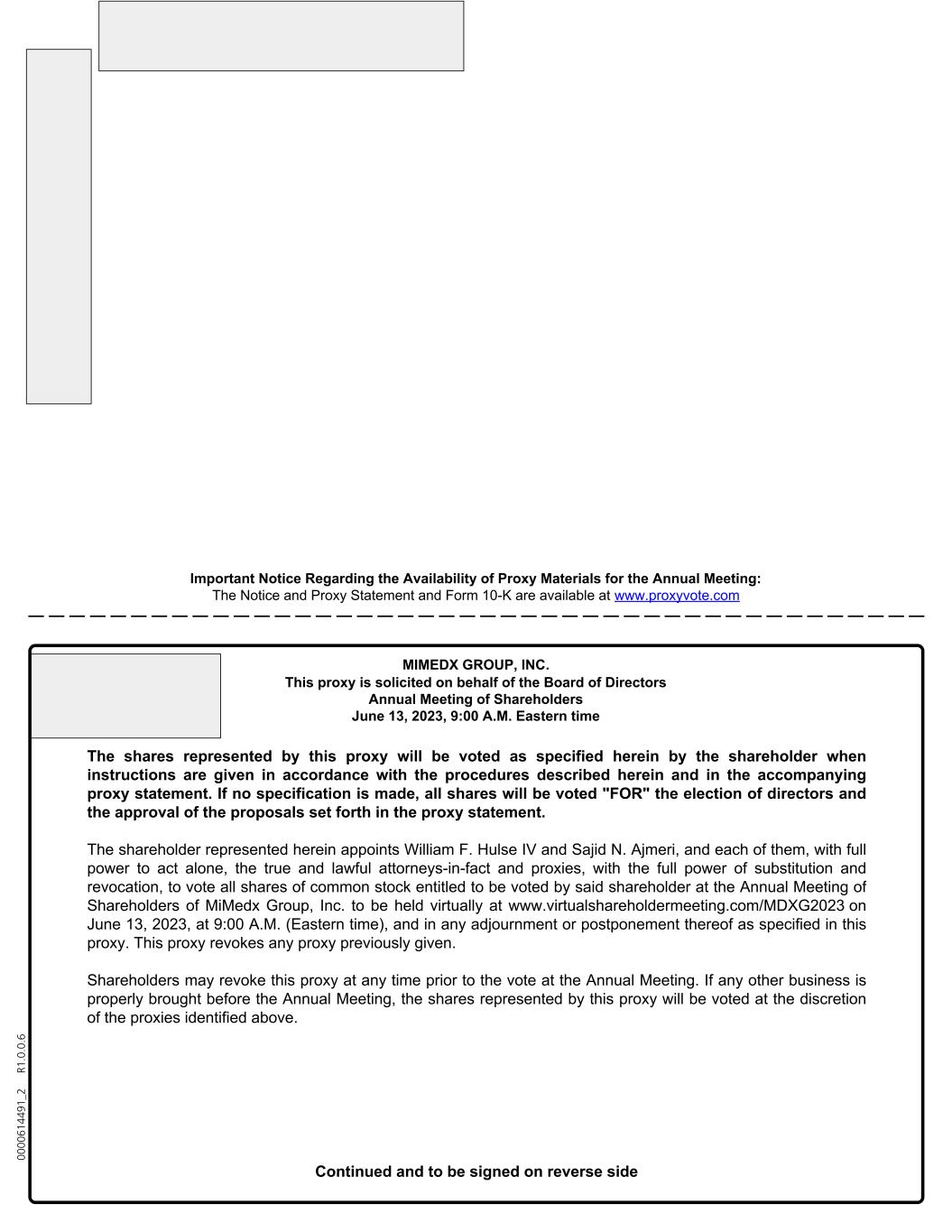 00 00 61 44 91 _2 R 1. 0. 0. 6 Important Notice Regarding the Availability of Proxy Materials for the Annual Meeting: The Notice and Proxy Statement and Form 10-K are available at www.proxyvote.com MIMEDX GROUP, INC. This proxy is solicited on behalf of the Board of Directors Annual Meeting of Shareholders June 13, 2023, 9:00 A.M. Eastern time The shares represented by this proxy will be voted as specified herein by the shareholder when instructions are given in accordance with the procedures described herein and in the accompanying proxy statement. If no specification is made, all shares will be voted "FOR" the election of directors and the approval of the proposals set forth in the proxy statement. The shareholder represented herein appoints William F. Hulse IV and Sajid N. Ajmeri, and each of them, with full power to act alone, the true and lawful attorneys-in-fact and proxies, with the full power of substitution and revocation, to vote all shares of common stock entitled to be voted by said shareholder at the Annual Meeting of Shareholders of MiMedx Group, Inc. to be held virtually at www.virtualshareholdermeeting.com/MDXG2023 on June 13, 2023, at 9:00 A.M. (Eastern time), and in any adjournment or postponement thereof as specified in this proxy. This proxy revokes any proxy previously given. Shareholders may revoke this proxy at any time prior to the vote at the Annual Meeting. If any other business is properly brought before the Annual Meeting, the shares represented by this proxy will be voted at the discretion of the proxies identified above. Continued and to be signed on reverse side