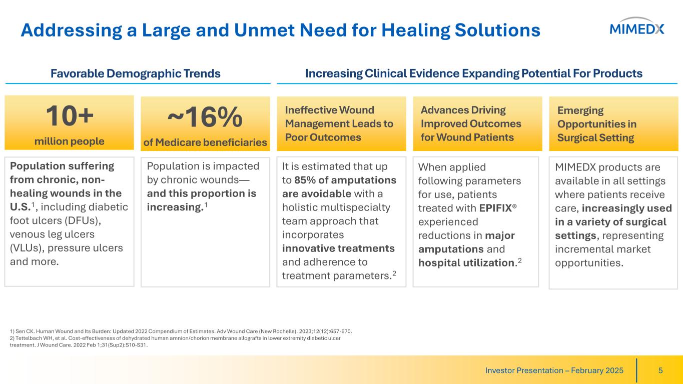Disclaimer & Cautionary Statements This presentation includes forward-looking statements. Forward-looking statements are subject to risks and uncertainties, and the Company cautions investors against placing undue reliance on such statements. Actual results may differ materially from those set forth in the forward-looking statements. Such forward-looking statements include statements regarding: • Future sales, sales growth, profitability and Adjusted EBITDA margins; • Estimates of potential market size and demand for the Company’s current and future products; • Plans for expansion outside of the U.S.; • The effectiveness of amniotic tissue as a therapy for any particular indication or condition; • Expected spending on research and development, including to innovate and diversify our product portfolio; • Investments in data; • Expectations regarding the reimbursement environment for the Company’s products, including Medicare Spending; • Manner of local coverage determination (LCD) implementation; • Expectations regarding plans to reduce customer churn and enhancing customer relationships; • Expectations that HELIOGEN will be a meaningful contributor to our financial performance in 2025; • The stage of development of the placental-derived products market; • The Company’s long-term strategy and goals for value creation, the status of its pipeline products, expectations for future products, and expectations for future growth and profitability Additional forward-looking statements may be identified by words such as "believe," "expect," "may," "plan," "potential," "will," "preliminary," and similar expressions, and are based on management's current beliefs and expectations. Forward-looking statements are subject to risks and uncertainties, and the Company cautions investors against placing undue reliance on such statements. Actual results may differ materially from those set forth in the forward-looking statements. Factors that could cause actual results to differ from expectations include: • Future sales are uncertain and are affected by competition, access to customers, patient access to hospitals and healthcare providers, the reimbursement environment and many other factors; • The future market for the Company’s products can depend on regulatory approval of such products, which might not occur at all or when expected, and is based in part on assumptions regarding the number of patients who elect less acute and more acute treatment than the Company’s products, market acceptance of the Company’s products, and adequate reimbursement for such therapies; • The process of obtaining regulatory clearances or approvals to market a biological product or medical device from the FDA or similar regulatory authorities outside of the U.S. is costly and time consuming, and such clearances or approvals may not be granted on a timely basis, or at all, and the ability to obtain the rights to market additional, suitable products depends on negotiations with third parties which may not be forthcoming; and • The Company describes additional risks and uncertainties in the Risk Factors section of its most recent annual report and quarterly reports filed with the Securities and Exchange Commission. Any forward-looking statements speak only as of the date of this presentation and the Company assumes no obligation to update any forward-looking statement. Investor Presentation – February 2025 2