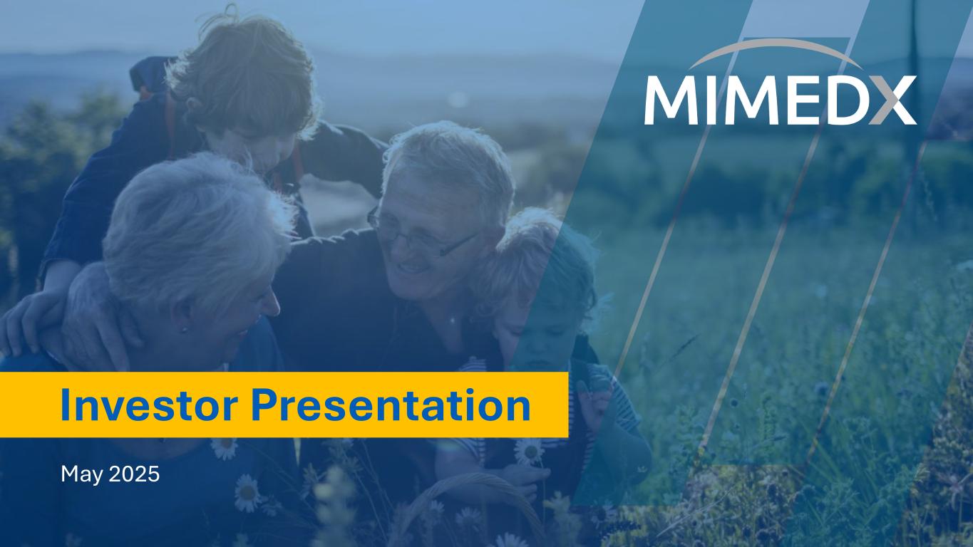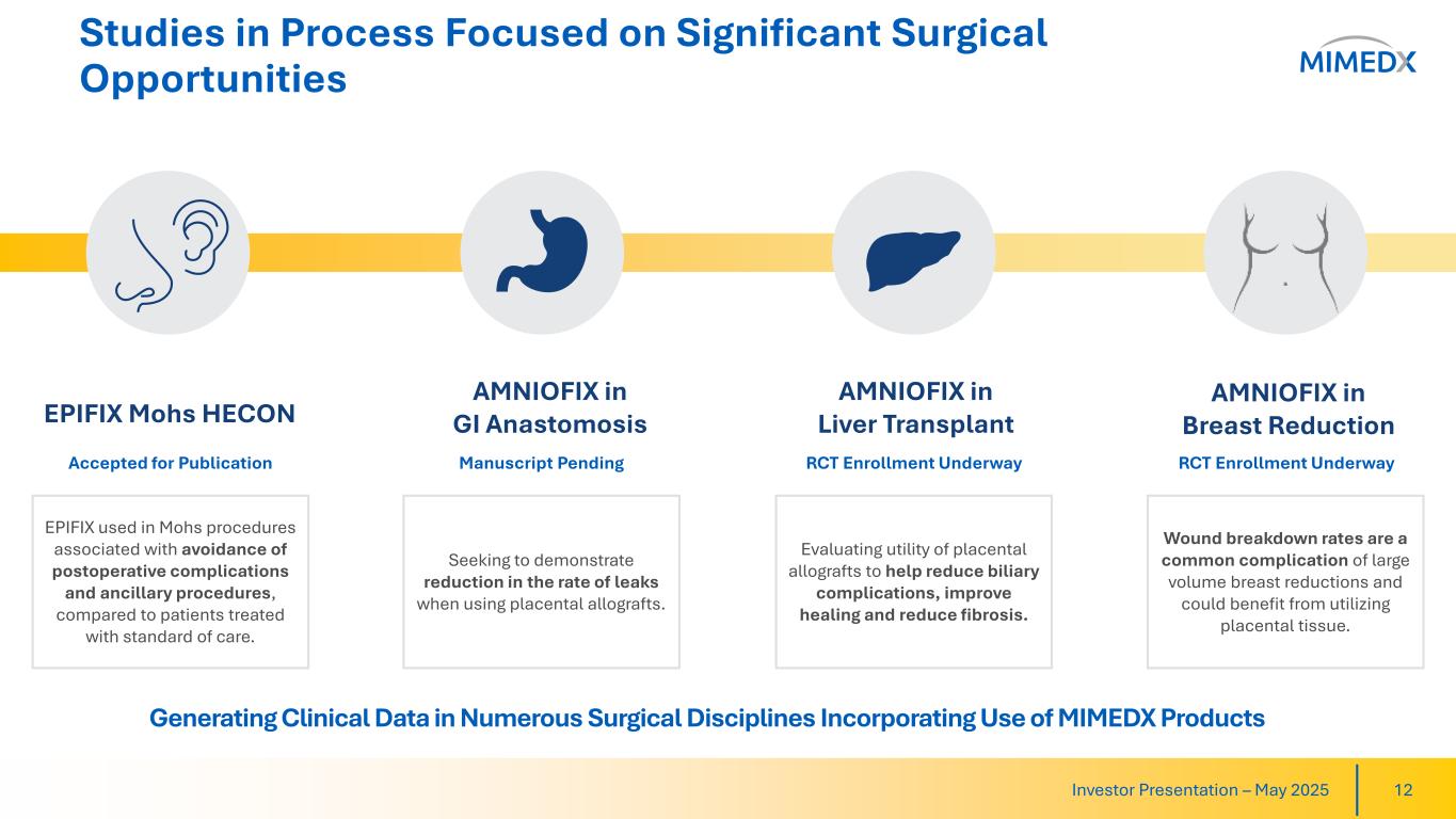 Building Library of Evidence for Surgical Applications 11Investor Presentation – May 2025 Recent Publications Showcase Breadth of Potential Use Cases for MIMEDX Products in Surgery Neuro Orthopedic Gastrointestinal Mohs Plastic OB/GYN Foot & Ankle Vascular Transplant Cranioplasty Procedures with AMNIOFIX® EPIFIX® in Mohs Procedures Colorectal Anastomoses Procedures with AMNIOFIX Anastomotic Leak Rate with & without AMNIOFIX3 4% 1.03% Conventional Closure Procedures with AMNIOFIX p=0.0022 Leak / N 80 / 2,000 4 / 390 Clinical Outcomes with Conventional Methods1 Clinical Outcomes with AMNIOFIX2 No intraoperative complications Minimal dural fibrosis in 86% of patients Average dissection time < 3 minutes Average dissection time ~30 minutes Frequent fibrosis reported Fibrosis has increased complications 1) Lee B. MIMEDX interview with Bryan Lee, MD. October 4, 2023. 2) Endicott L, Ehresman J, Tettelbach W, Forsyth A, Lee B. Dehydrated human amnion/chorion membrane (DHACM) use in emergent craniectomies shows minimal dural adhesions. J Wound Care. 2023;32(10):634-640. 3) F. Raymond Ortega, MD, FACS; Dennis Choat, MD, FACS, FASCRS; Emery Minnard, MD; Jeffrey Cohen, MD. The American College of Surgeons Clinical Congress, Oct 22-26, 2017, San Diego, CA. 4) Toman J. Facial Plast Surg Aesthet Med. 2022;24(1):48-53. 5) Franklin Polun, DPM, DABFAS, FACFAS FACFAS; Jake Michaelson. Symposium on Advanced Wound Care Fall, Nov 2-5, 2023, Las Vegas, NV. AMNIOEFFECT® in Bunion Correction Surgery 8% 10% 10% 15% 29% 0% 0% 2% 0% 2% Surgical Reintervention Revisions Infection Poor Cosmesis Experienced Complications Autologous Flap / FTSG Group (n=143) dHACM Group (n=143) Case Study5 – SAWC Fall 2023 The use of LHACM as a barrier membrane during Lapiplasty 3D Bunion Correction surgery is an effective strategy to improve surgical outcomes. Peer-reviewed Retrospective Study4 Urology