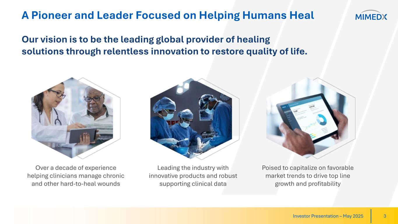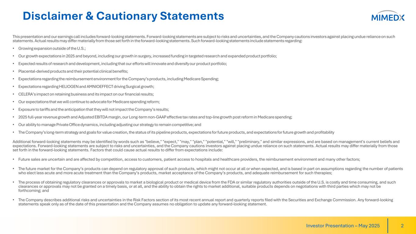 Disclaimer & Cautionary Statements This presentation and our earnings call includes forward-looking statements. Forward-looking statements are subject to risks and uncertainties, and the Company cautions investors against placing undue reliance on such statements. Actual results may differ materially from those set forth in the forward-looking statements. Such forward-looking statements include statements regarding: • Growing expansion outside of the U.S.; • Our growth expectations in 2025 and beyond, including our growth in surgery, increased funding in targeted research and expanded product portfolio; • Expected results of research and development, including that our efforts will innovate and diversify our product portfolio; • Placental-derived products and their potential clinical benefits; • Expectations regarding the reimbursement environment for the Company’s products, including Medicare Spending; • Expectations regarding HELIOGEN and AMNIOEFFECT driving Surgical growth; • CELERA’s impact on retaining business and its impact on our financial results; • Our expectations that we will continue to advocate for Medicare spending reform; • Exposure to tariffs and the anticipation that they will not impact the Company’s results; • 2025 full-year revenue growth and Adjusted EBITDA margin, our Long-term non-GAAP effective tax rates and top-line growth post reform in Medicare spending; • Our ability to manage Private Office dynamics, including adjusting our strategy to remain competitive; and • The Company’s long-term strategy and goals for value creation, the status of its pipeline products, expectations for future products, and expectations for future growth and profitability Additional forward-looking statements may be identified by words such as "believe," "expect," "may," "plan," "potential," "will," "preliminary," and similar expressions, and are based on management's current beliefs and expectations. Forward-looking statements are subject to risks and uncertainties, and the Company cautions investors against placing undue reliance on such statements. Actual results may differ materially from those set forth in the forward-looking statements. Factors that could cause actual results to differ from expectations include: • Future sales are uncertain and are affected by competition, access to customers, patient access to hospitals and healthcare providers, the reimbursement environment and many other factors; • The future market for the Company’s products can depend on regulatory approval of such products, which might not occur at all or when expected, and is based in part on assumptions regarding the number of patients who elect less acute and more acute treatment than the Company’s products, market acceptance of the Company’s products, and adequate reimbursement for such therapies; • The process of obtaining regulatory clearances or approvals to market a biological product or medical device from the FDA or similar regulatory authorities outside of the U.S. is costly and time consuming, and such clearances or approvals may not be granted on a timely basis, or at all, and the ability to obtain the rights to market additional, suitable products depends on negotiations with third parties which may not be forthcoming; and • The Company describes additional risks and uncertainties in the Risk Factors section of its most recent annual report and quarterly reports filed with the Securities and Exchange Commission. Any forward-looking statements speak only as of the date of this presentation and the Company assumes no obligation to update any forward-looking statement. Investor Presentation – May 2025 2