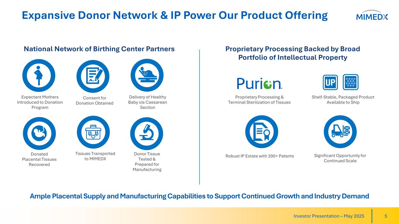 The Most Comprehensive End-to-End Product Ecosystem 4Investor Presentation – May 2025 The most studied portfolio of placental products with 50+ clinical & scientific publications and over 300 million payer covered lives. New product innovations leading to untapped opportunities for growth, including an increasing footprint in the Surgical market. A key partner to healthcare professionals with industry leading support services and customer-focused approach. Large, national placental donation network and proprietary tissue processing.