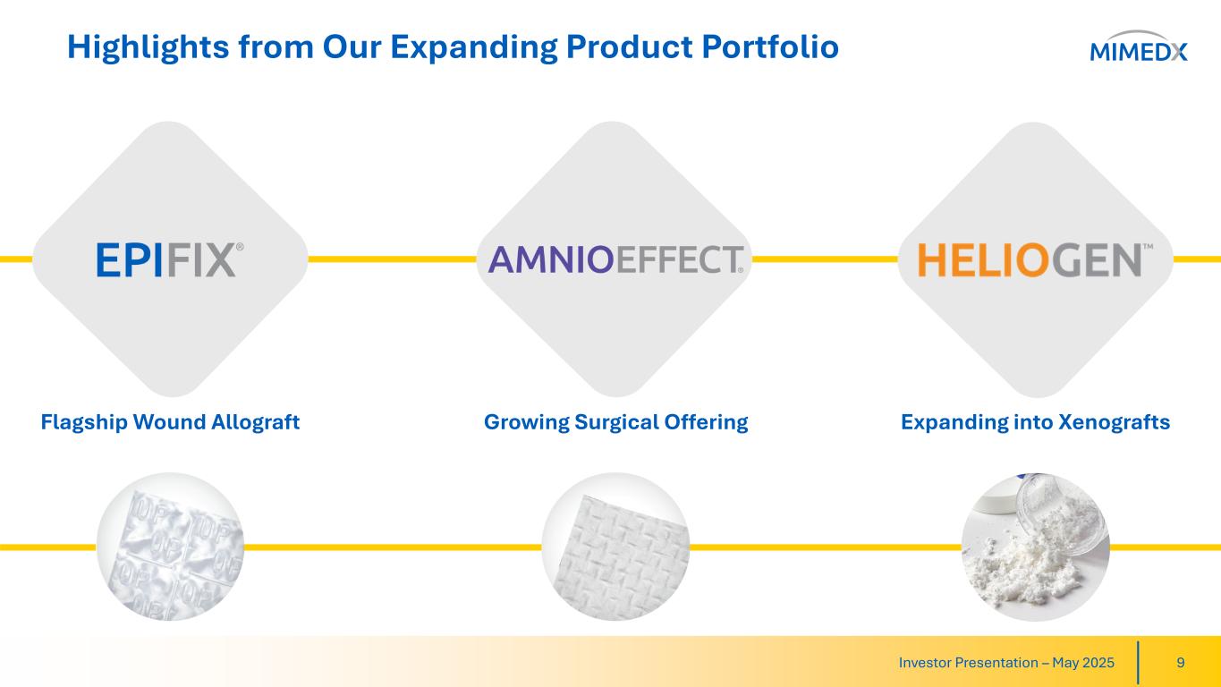 The Patient Journey in Wound Care 8Investor Presentation – May 2025 Private Office Home Health Mobile Health Nursing Facility Assisted Living Facility Wound Care Clinic Hospital Outpatient Hospital Inpatient …and other care settings Mohs surgery Burn/Trauma DFU VLU Limb Salvage Dehiscence Acute Wounds Chronic Wounds Complex Wounds MIMEDX products are available throughout the continuum of care and are used on a range of chronic and other hard-to-heal wounds.