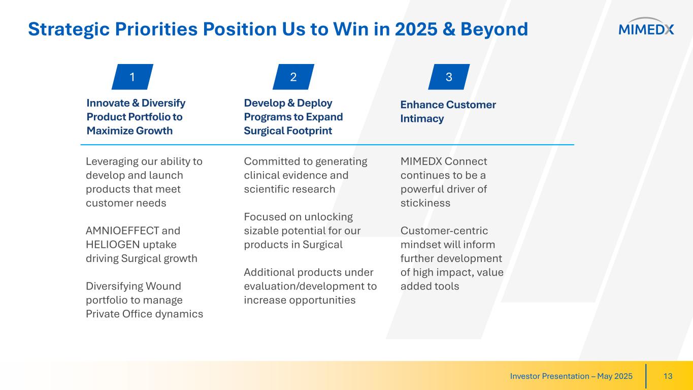 Studies in Process Focused on Significant Surgical Opportunities 12Investor Presentation – May 2025 EPIFIX used in Mohs procedures associated with avoidance of postoperative complications and ancillary procedures, compared to patients treated with standard of care. Accepted for Publication Seeking to demonstrate reduction in the rate of leaks when using placental allografts. Evaluating utility of placental allografts to help reduce biliary complications, improve healing and reduce fibrosis. Wound breakdown rates are a common complication of large volume breast reductions and could benefit from utilizing placental tissue. Manuscript Pending RCT Enrollment Underway RCT Enrollment Underway Generating Clinical Data in Numerous Surgical Disciplines Incorporating Use of MIMEDX Products EPIFIX Mohs HECON AMNIOFIX in GI Anastomosis AMNIOFIX in Liver Transplant AMNIOFIX in Breast Reduction