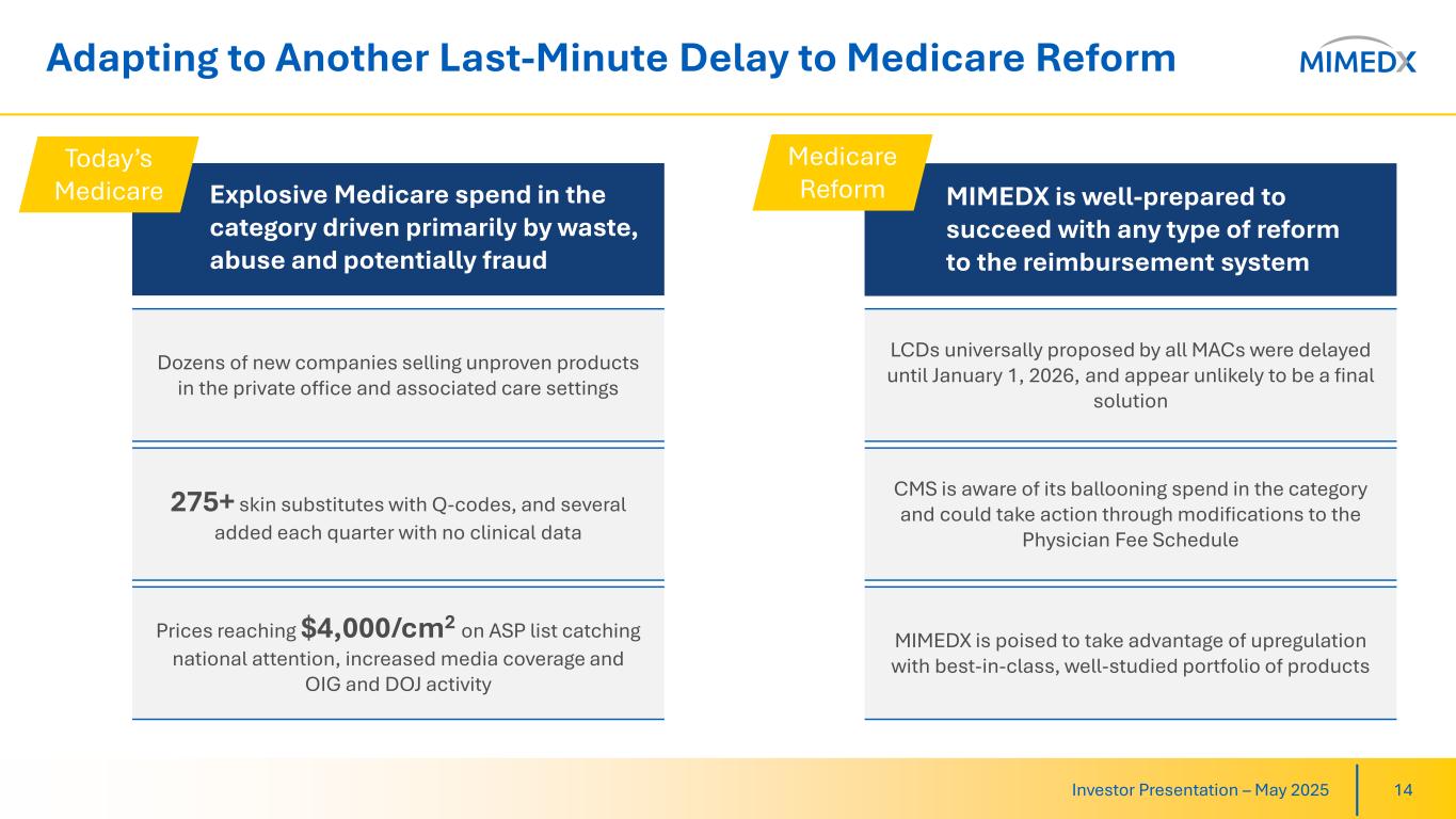 Strategic Priorities Position Us to Win in 2025 & Beyond Investor Presentation – May 2025 13 Innovate & Diversify Product Portfolio to Maximize Growth Develop & Deploy Programs to Expand Surgical Footprint Enhance Customer Intimacy Leveraging our ability to develop and launch products that meet customer needs AMNIOEFFECT and HELIOGEN uptake driving Surgical growth Diversifying Wound portfolio to manage Private Office dynamics Committed to generating clinical evidence and scientific research Focused on unlocking sizable potential for our products in Surgical Additional products under evaluation/development to increase opportunities MIMEDX Connect continues to be a powerful driver of stickiness Customer-centric mindset will inform further development of high impact, value added tools 1 2 3