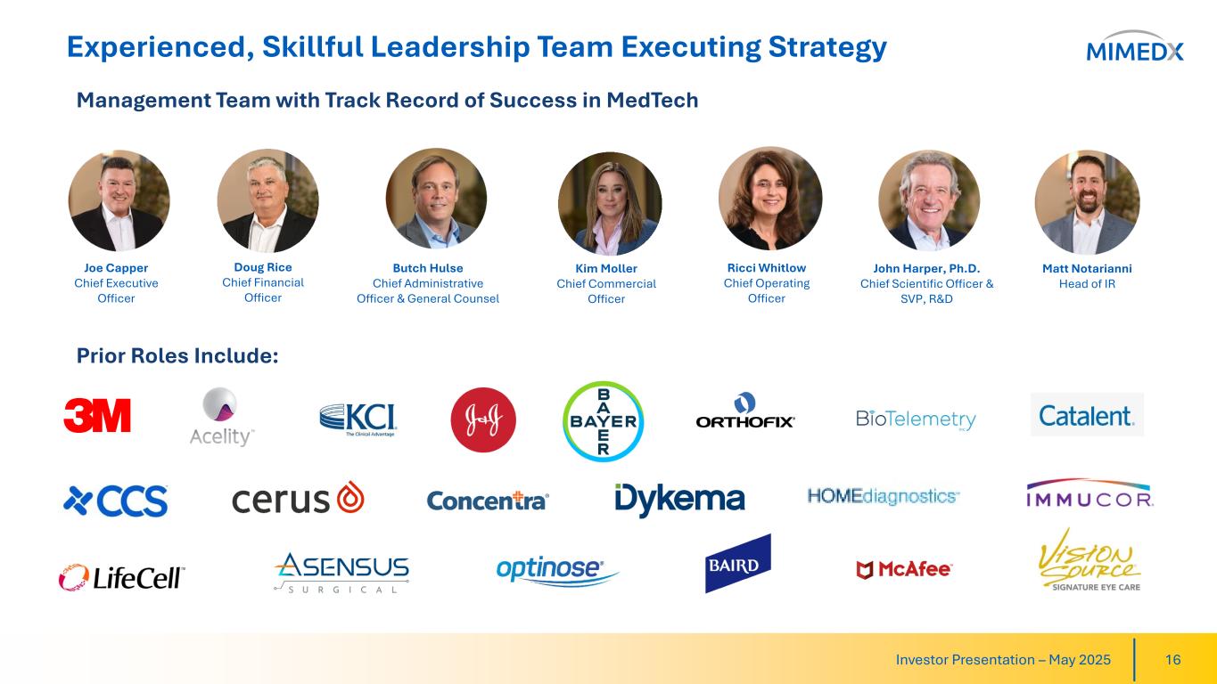 Financial Highlights 15Investor Presentation – May 2025 LTM Net Sales $352MM +5% year-over-year LTM GAAP Gross Margin 82% LTM Adjusted EBITDA1 $75MM 21% of net sales LTM GAAP Net Income $40MM Net Cash Balance $88MM +$59MM vs. Q1:24 LTM Free Cash Flow $65MM Strong & improving financial profile & balance sheet provides growth capital for the business Quarterly Net Cash Balance 1) EBITDA, Adjusted EBITDA, related margins and Free Cash Flow are non-GAAP financial measures. See our Earnings Release for the quarter ended March 31, 2025 for a reconciliation to the nearest GAAP measure. $29MM $50MM $70MM $86MM $88MM Q1:24 Q2:24 Q3:24 Q4:24 Q1:25